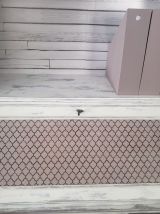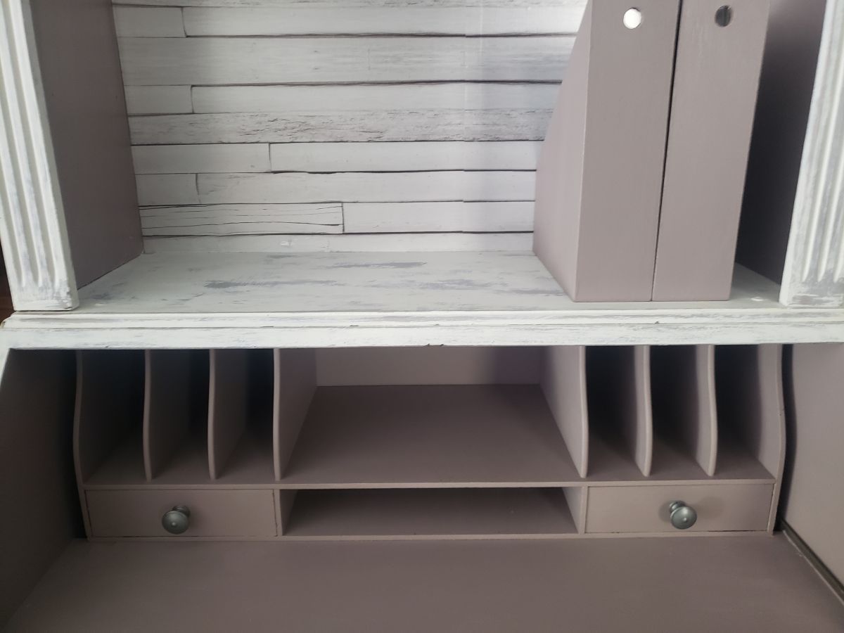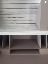 1 bibliothèque avec 3 tablettes, (2 visibles sur photo mais une 3ème fournie) + 2 range documents en bois de couleur taupe assortie au meuble. Dimensions: l 85 X p 28 X h 105 cm. L’ensemble du meuble a été relooké: patine blanche sur couleur taupe pour toutes les parties extérieures. Pour l’élément inférieur, (partie bureau): décor effet grillage trompe l’œil, entièrement réalisé à la main sur la partie extérieure de la tablette du bureau. Sous-main en cuir, d’origine. Intérieur rangements bureau + le rangement du bas avec une étagère en couleur taupe. Partie supérieure, le fond de l’étagère est recouvert de papier autocollant trompe œil bois et les 2 côtés intérieurs en taupe. Le meuble est protégé par vernis vitrificateur mat (plusieurs couches) pour + de résistance au temps aux chocs. Dimensions totales h 205 X p 51 X l 85 cm.