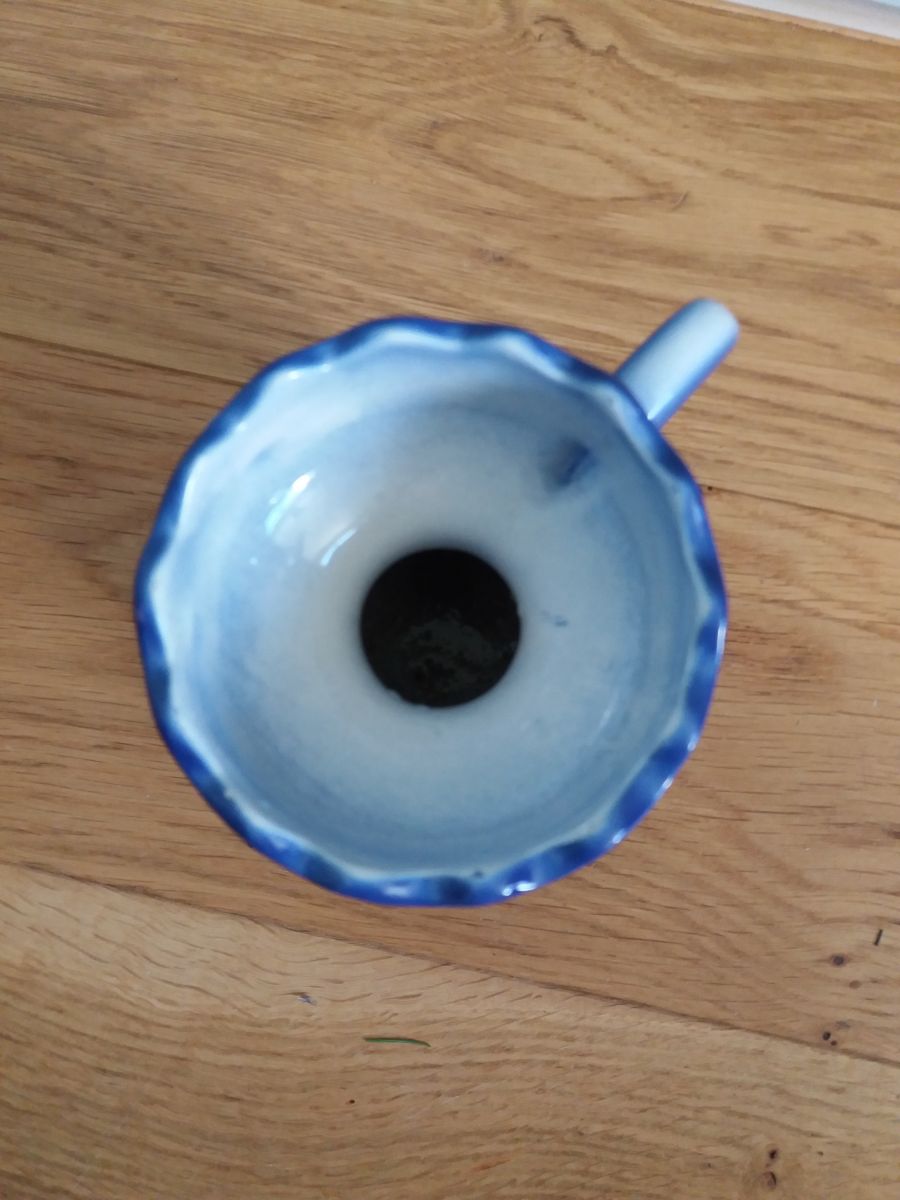 Charmant objet en céramique dans les tons bleus, je penche pour un bougeoir, mais en réalité je n'en suis pas certaine ! Cela pourrait aussi bien être un petit vase ! En tout cas, l'objet est beau, avec un charmant décor peint à la main, un travail très fin, réalisé par un artiste qui a un joli coup de pinceau. Il est en parfait état, ni fêle, ni éclat. Il mesure 13, 5 cm de hauteur, 11 cm de diamètre au niveau du socle, et 13 cm de largeur anse comprise. Il pèse environ 500 g.