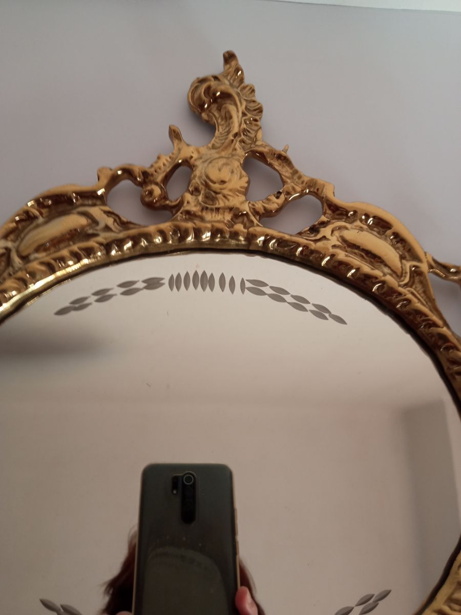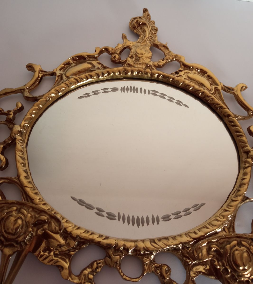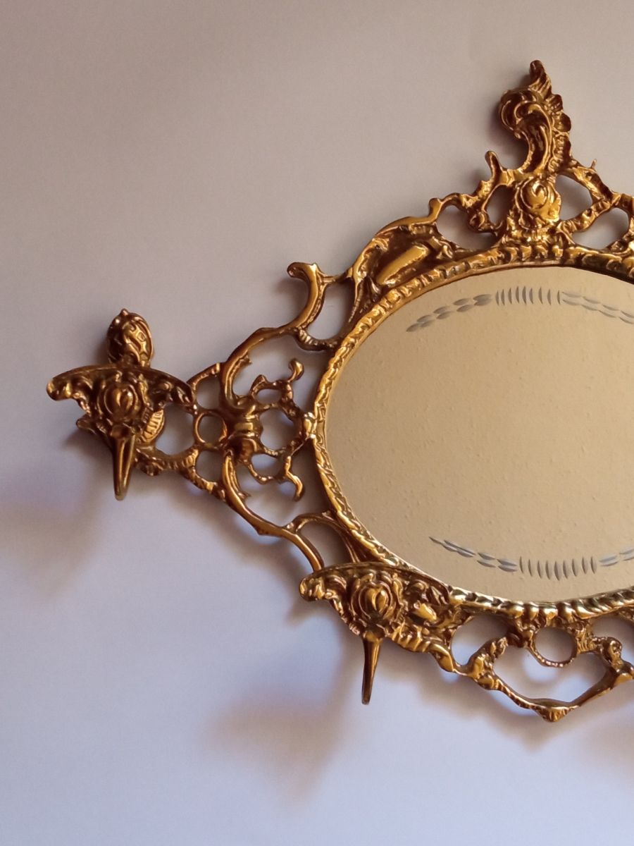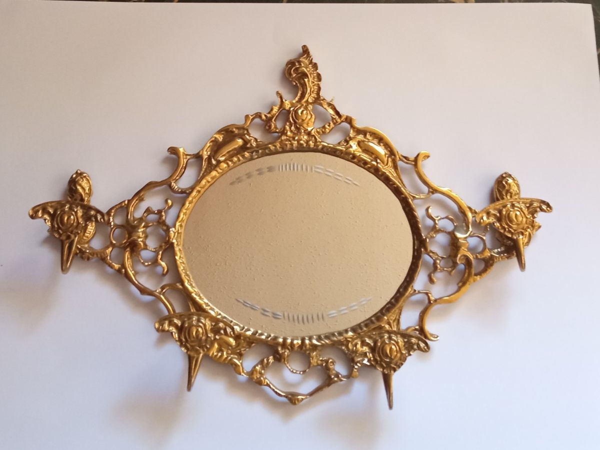 Marque : Porte-manteau mural en bronze avec 4 patères et miroir gravé. Daté des années 50. Très bon état.