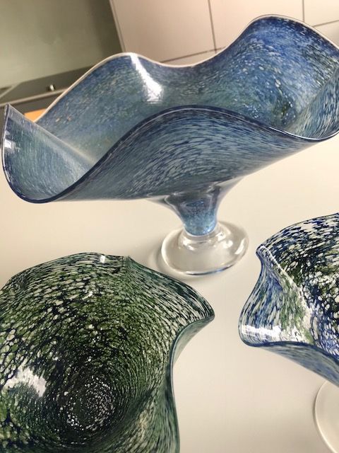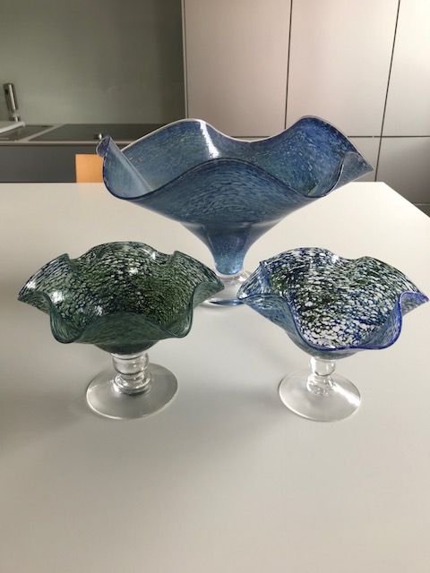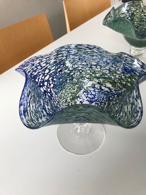 Très jolie coupe en verre faite à la main. Verre soufflé vert et bleu.