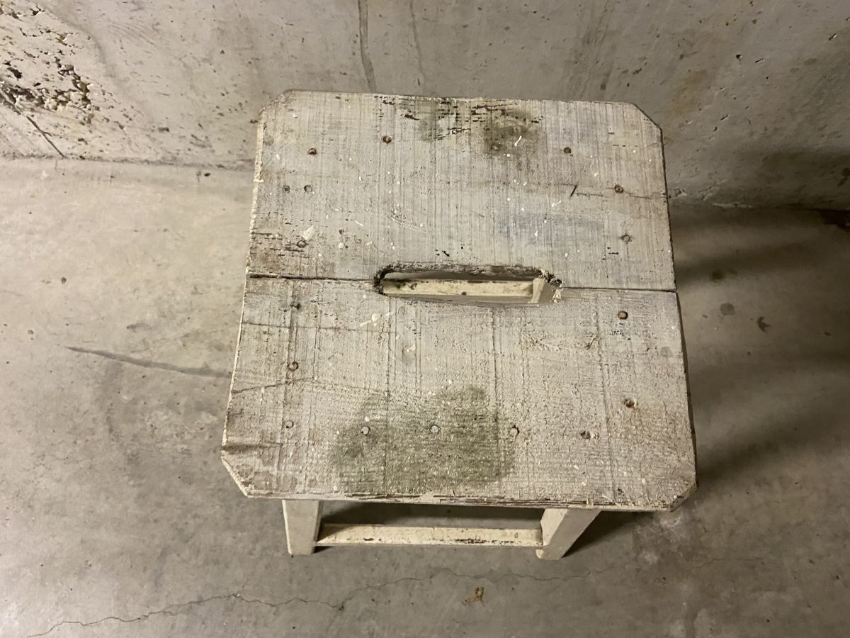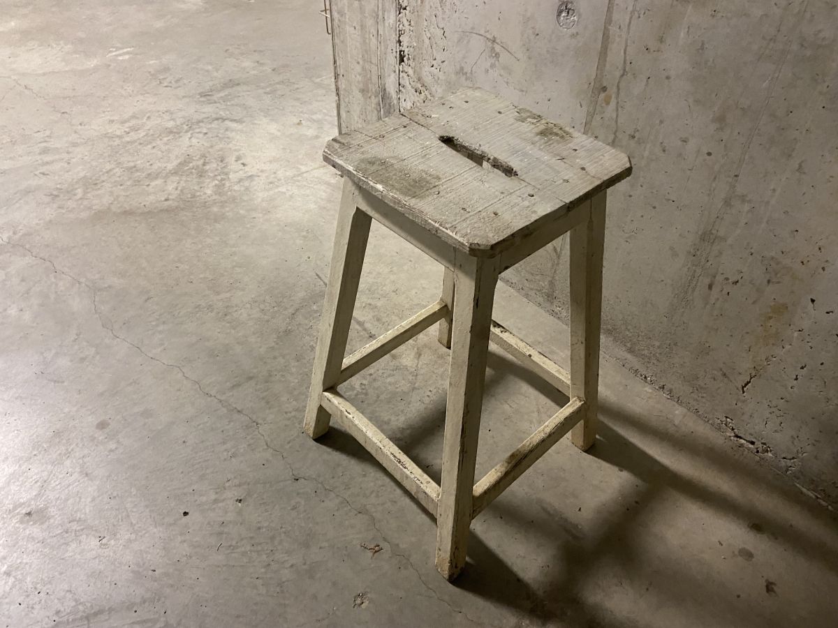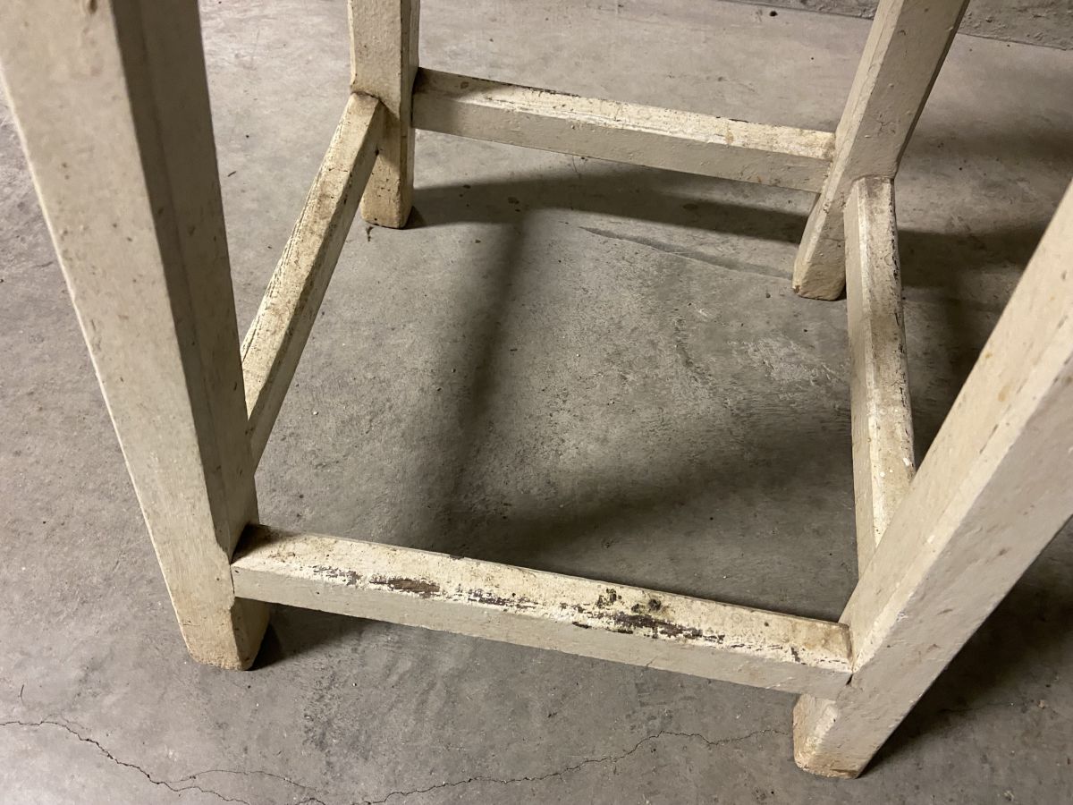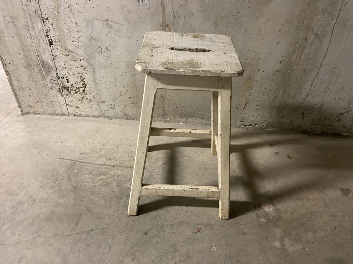 Ancien tabouret d’atelier en bois peint en blanc, laissé volontairement dans son jus afin de conserver le charme et la patine, hauteur 60cm, assise 29x29cm.