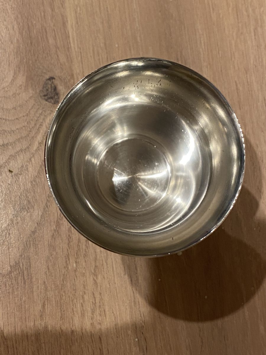 Timbale sur piédouche en métal blanc argenté de l’orfèvre Ravinet Denfer. Simple, élégante, look art-déco, état général correct, traces d'usage, nettoyée (voir photos avant après). Diamètre du buvant 7 cm, diamètre du pied 4,9 cm, hauteur 7,8 cm. Poids 108 g. V766