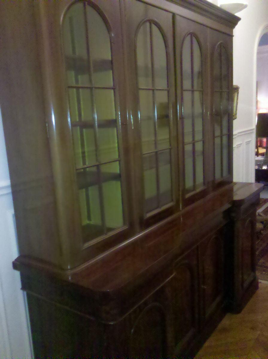English bookcase in solid mahogany with parts veneered in mahogany feather, friezes on the uprights, from the Victorian period, end 19th century, completely authentic including its height-adjustable shelves. Oversized bookcase and therefore very difficult to find.