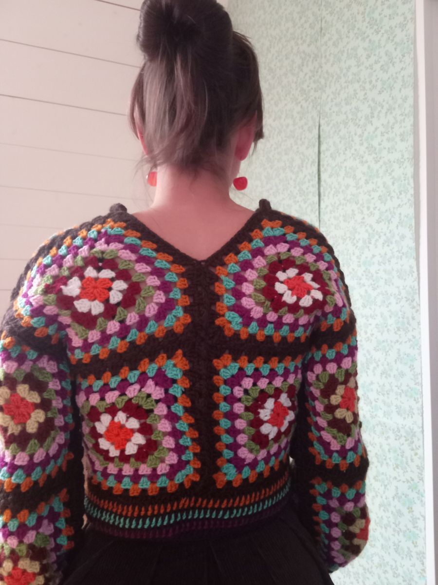 Pull crocheté main, multicolore, fil laine/ acrylique, méthode granny square, col V, manches 3/4.