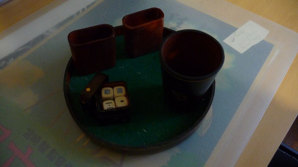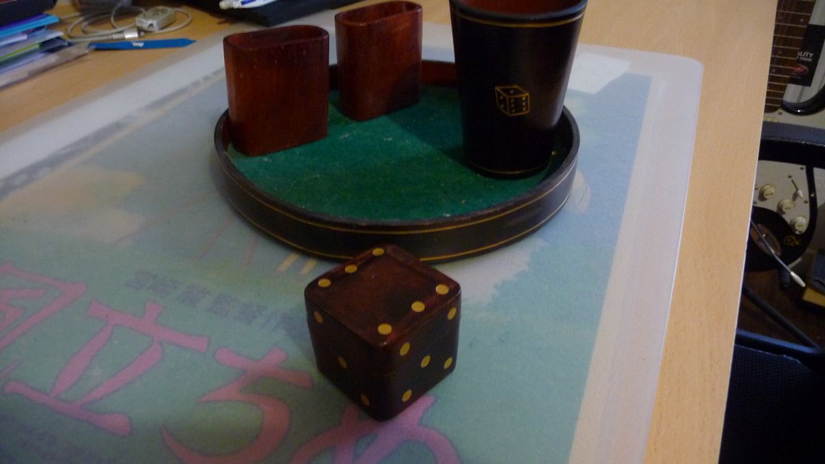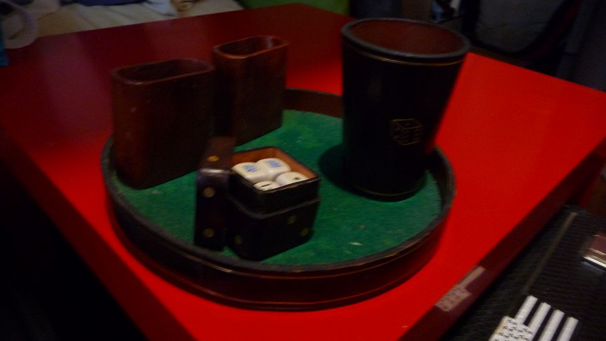 Plateau de jeu de dés avec 2 étuis en bois pour ranger des jeux de cartes, un gobelet pour remuer les dés, et 5 dés de poker d'as (9, 10,valet, dame, roi, as) + 3 dés classiques dans un joli étui en cuir en forme de dé.