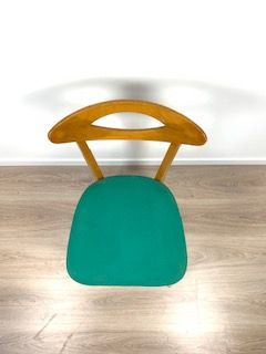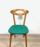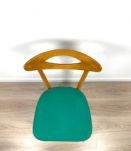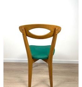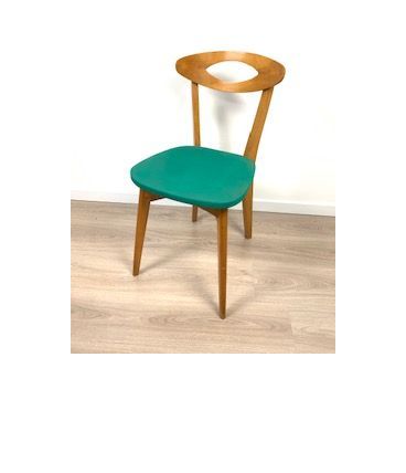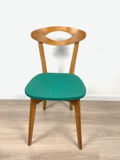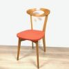 Très belle chaise au design typique des années 60. L'armature est en bois massif. L'assise est rembourrée et tapissée de vinyle.