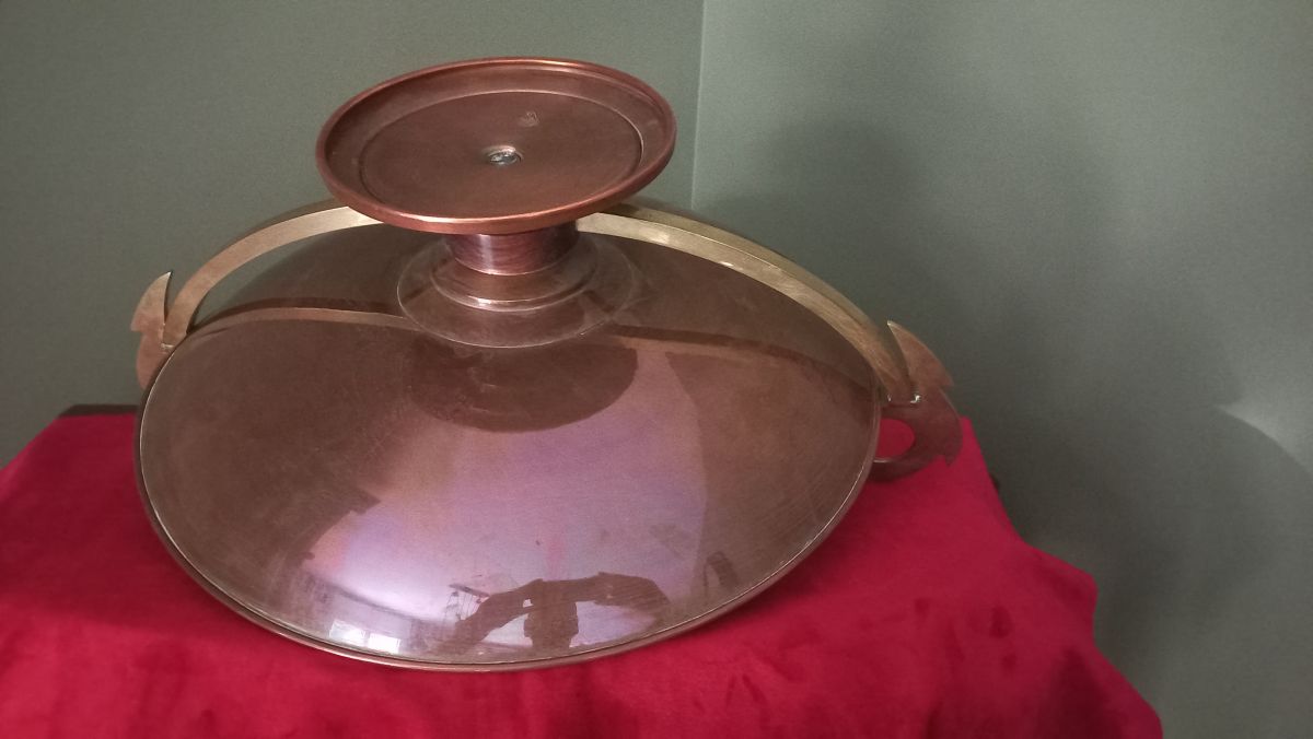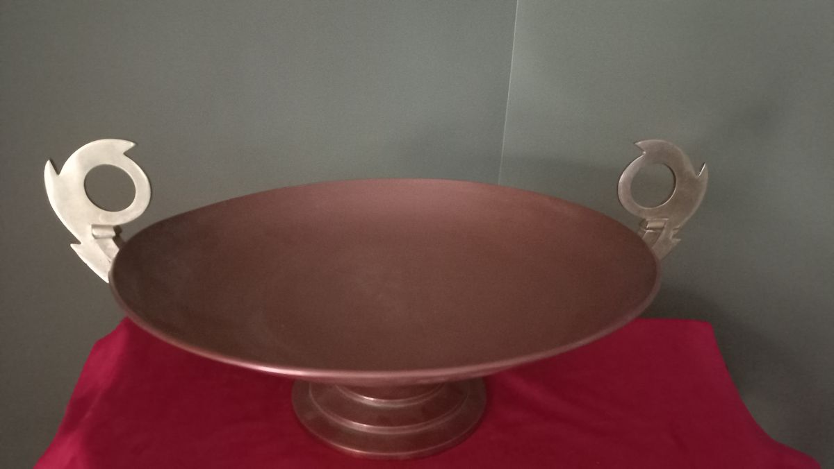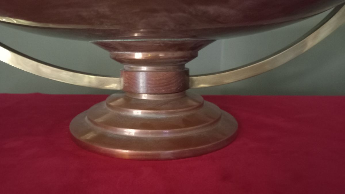 Grande coupe à fruit sur pied en cuivre , laiton et bois de Macassar