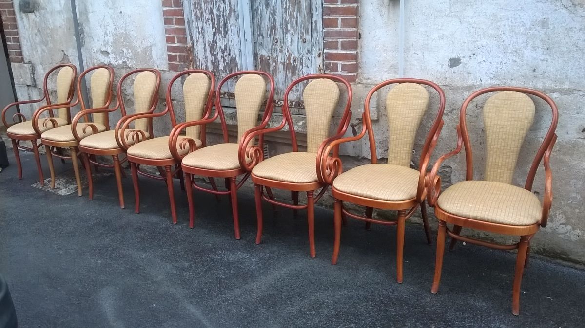 Ensembles de 8 fauteuil en bois courbé réédition fmg (fabryka mebli gietych) est une fabrique polonaise de meubles en bois courbé, produisant dans l'ancienne usine thonet de jasienica créée en 1881. Les assise et dossier sons recouvert d un tissu de couleur or. Les chaises sons stable et solide. La patine est un peu plus claire sur certaines chaise du probablement au soleil. Hauteur totale dossier 90 cm. Hauteur assise 47 cm. Diamètre assise 43 sur 44 cm de largeur. Hauteur accoudoir 65 cm. D autres série sons en vente dans mes annonce.