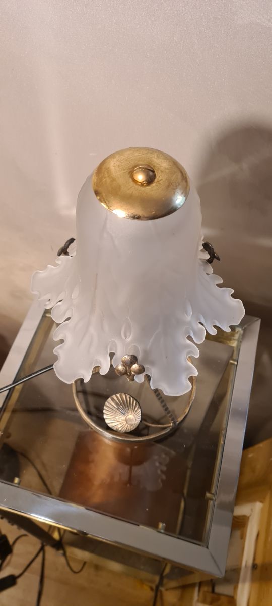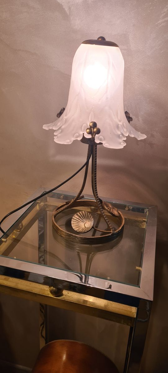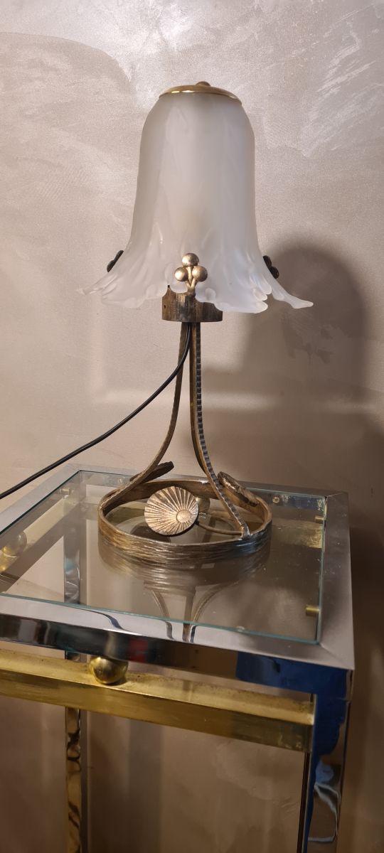 lampe fer forgé ,patiné or tres belle tulipe en verre epais opaque et moulé 35x17