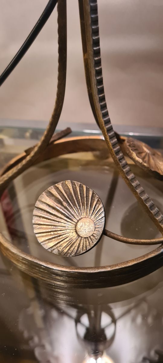 lampe fer forgé ,patiné or tres belle tulipe en verre epai