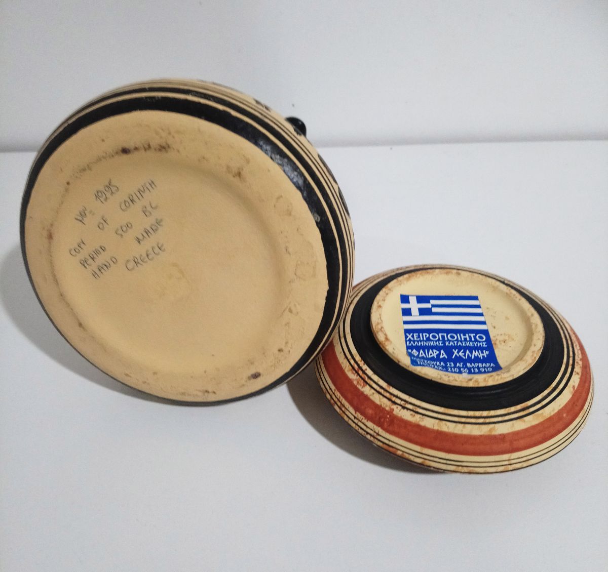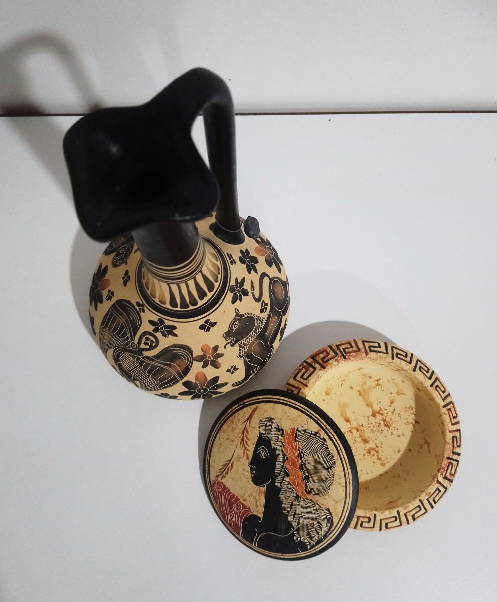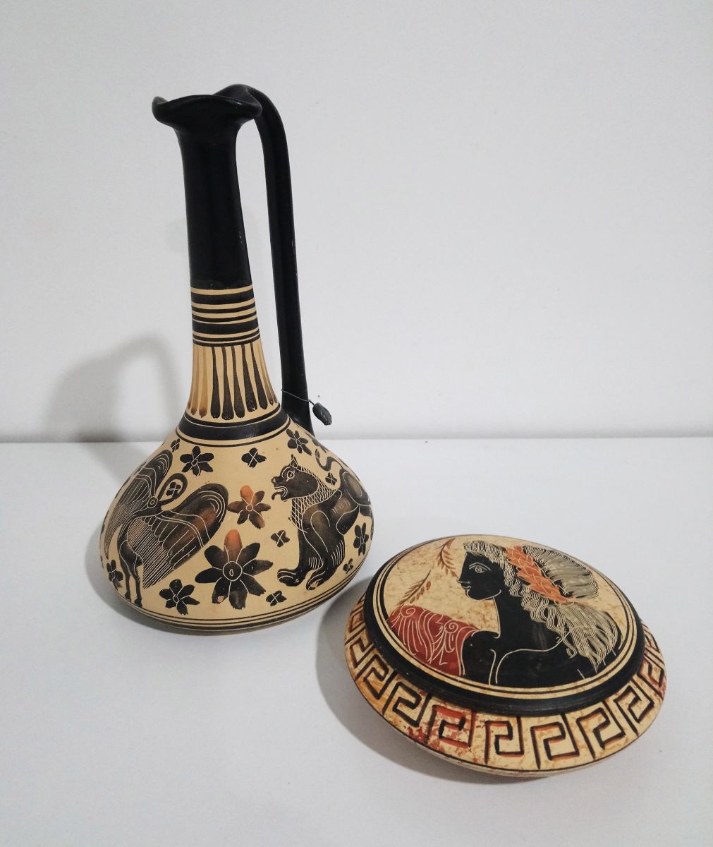 Deux bibelots grecs, une boîte ronde et un soliflor.