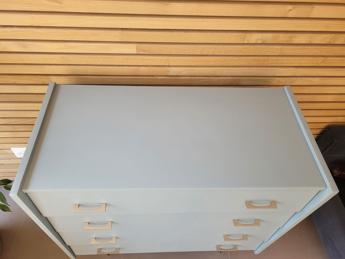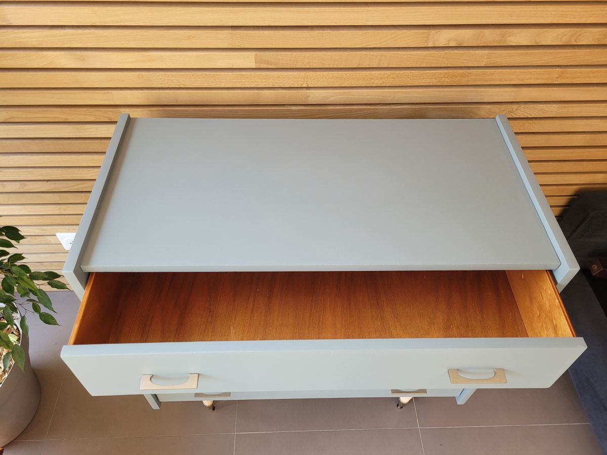 Grande commode vintage années 60 en bois avec pieds fuseaux. Elle a été entièrement restaurée: nettoyée, poncée repeinte dans la nuance "étourneau" de chez Ressource (mate légèrement satinée). La commode est en bon état. Les poignées en laiton sont d'origine, les pieds sont laissés en bois brut. Le meuble est sain, stable et propre. Les tiroirs coulissent parfaitement. Malgré tout le soin apporté à sa restauration, quelques traces du temps subsistent, mais elles sont infimes.
