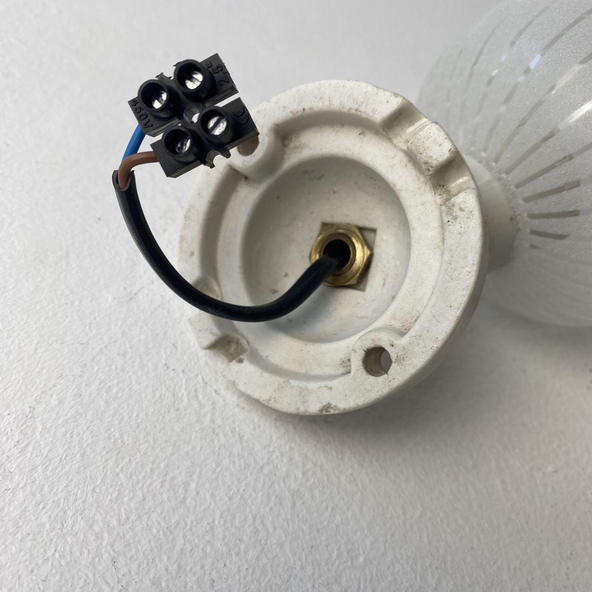 L’électricité a été refaite. Douille à baïonnette en céramique (Ampoules B22) et branchement par domino.