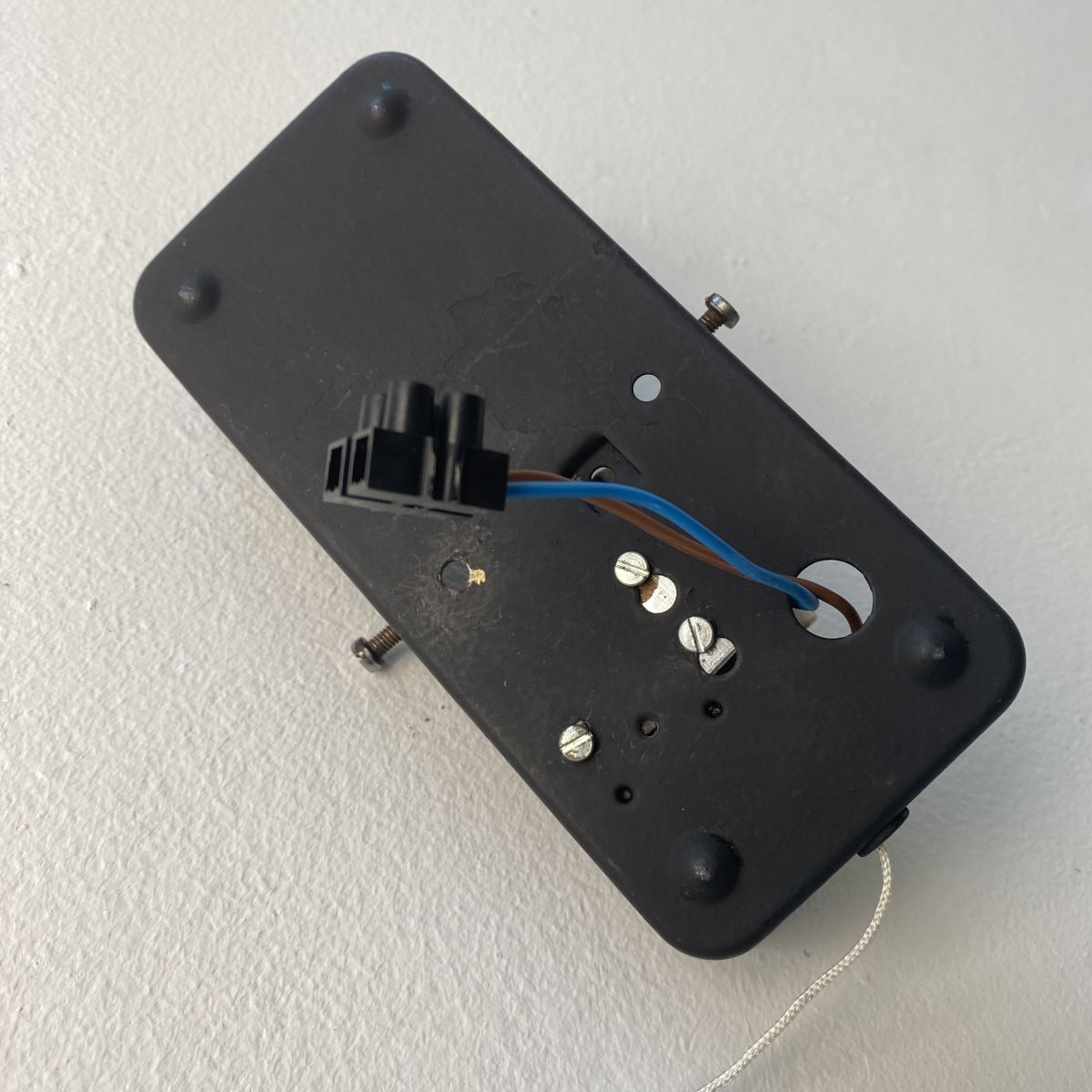 La base a été poncée et repeinte avec une peinture noire haute température. L’électricité a été refaite. L’interrupteur à tirette a également été remplacé. Douille à vis petit culot (Ampoules E14).