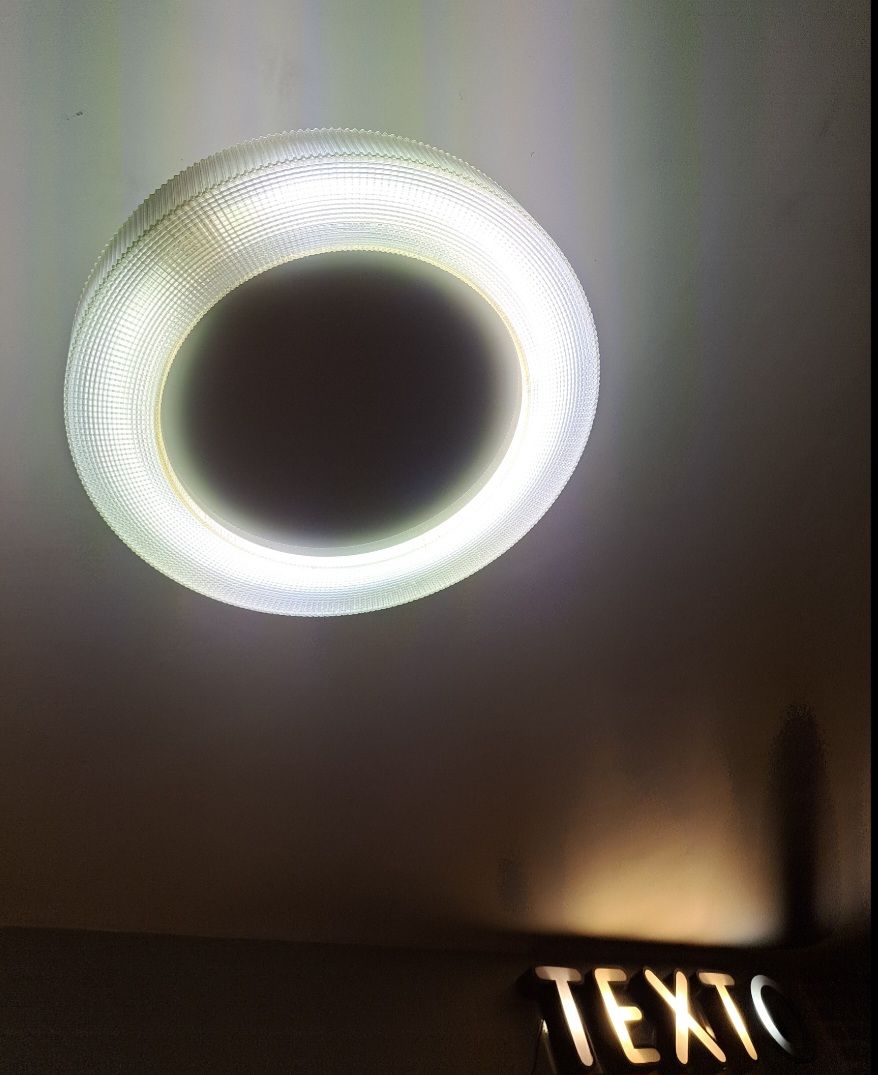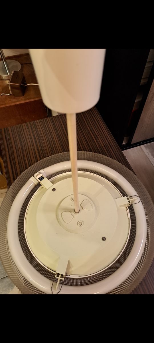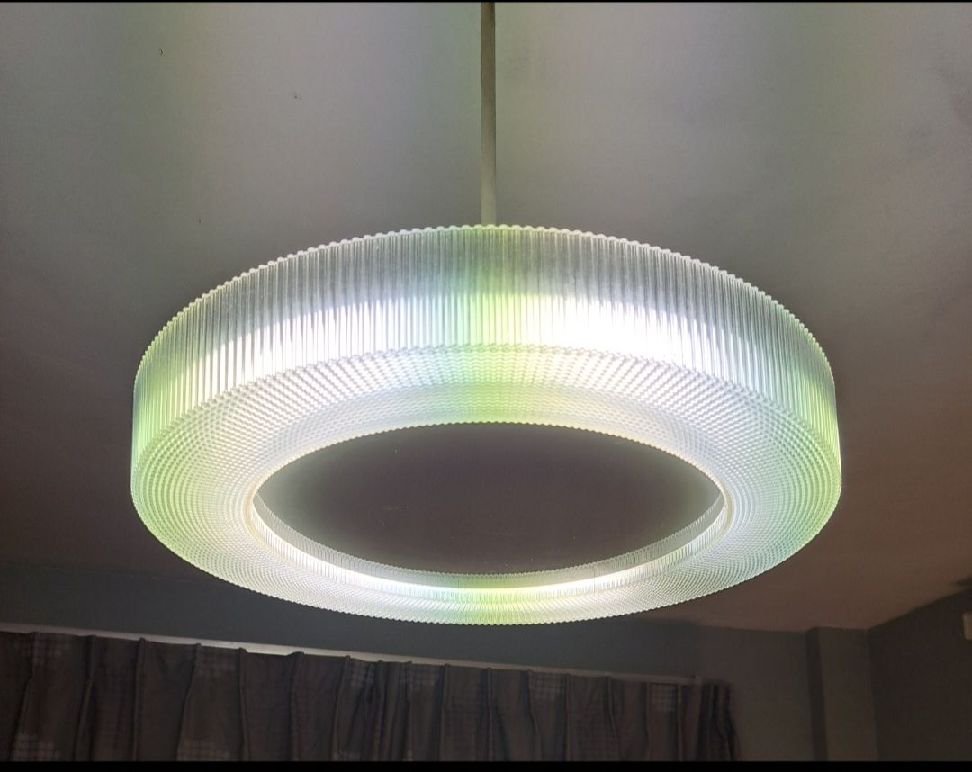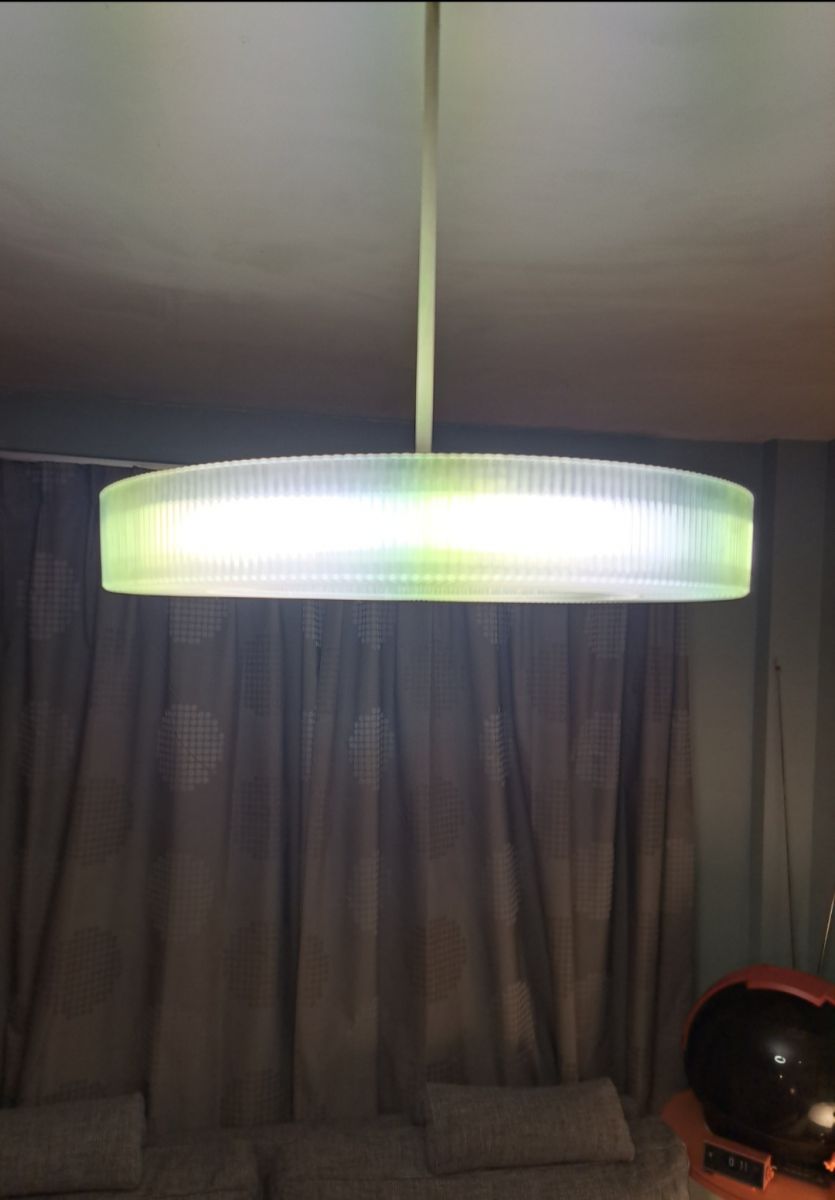 Grande Suspension design très épuré en forme d'anneau de l'ère spacial UFO des années 60 70. Luminaire de qualité, de différents matériaux, plastique moulé cannelé cristallines transparent, son coeur en plastique brillant et son corps en acrylique le tout sur une tige en métal, son tube néon nous offre une source de lumière riche et blanche.