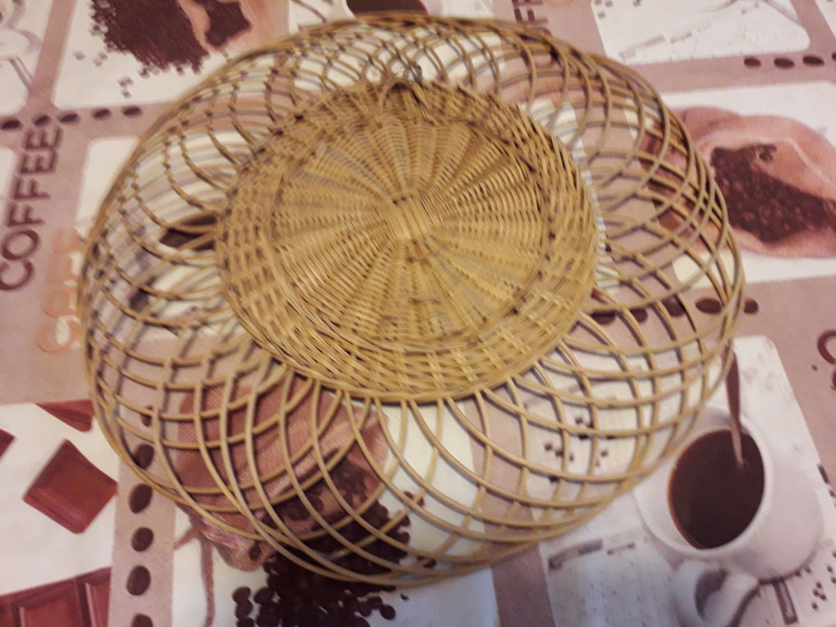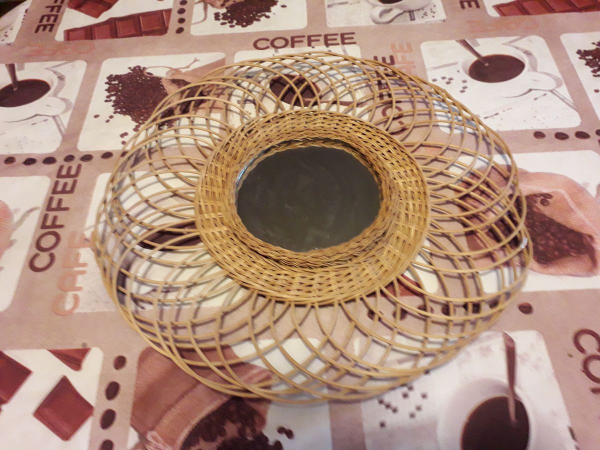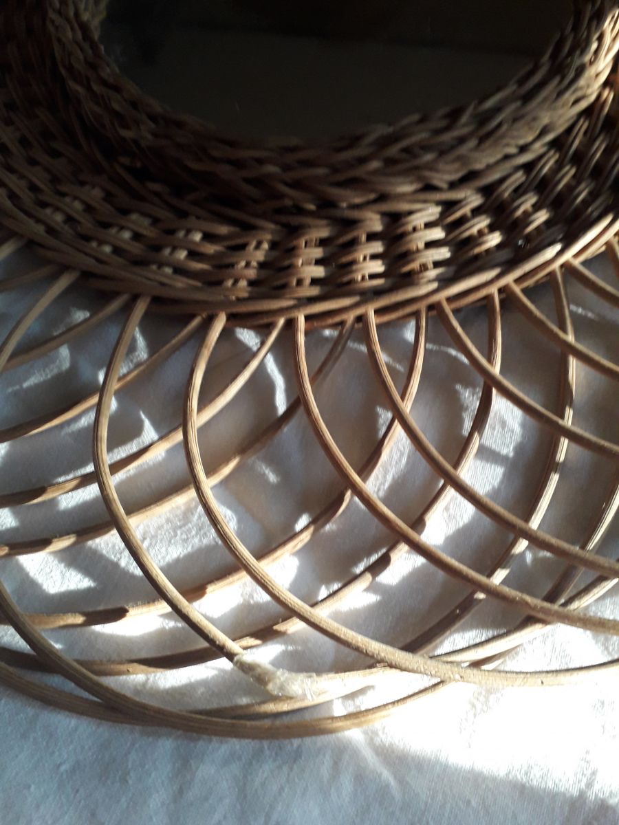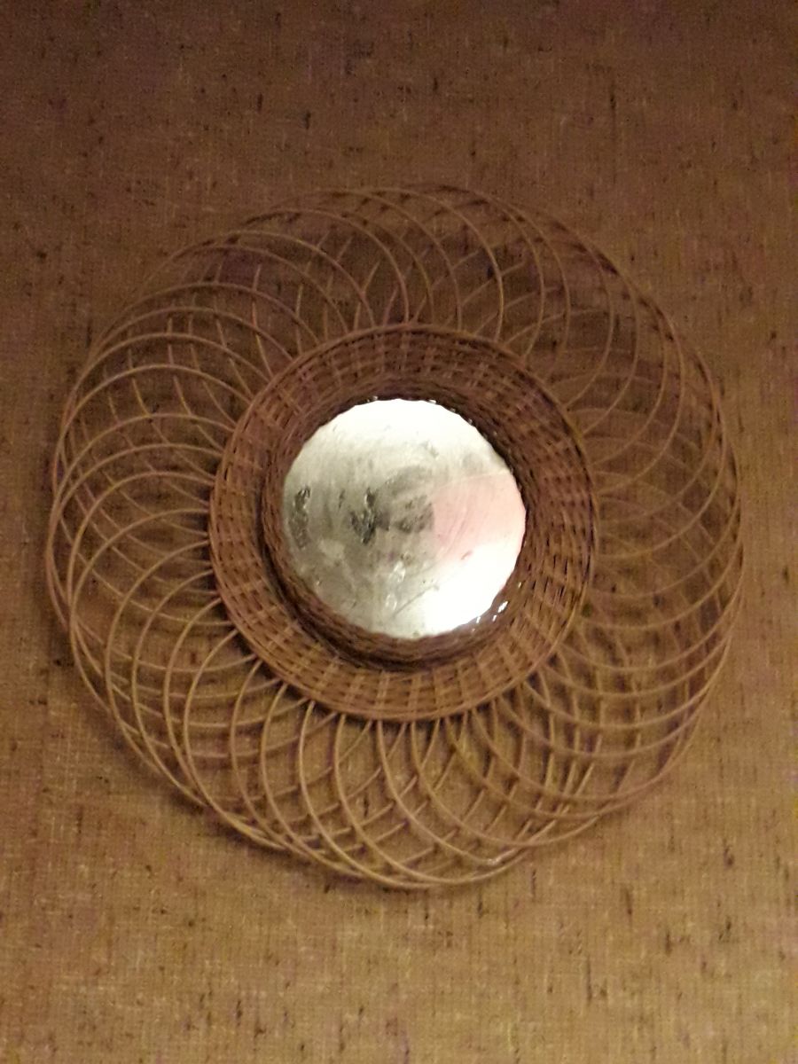 Miroir vintage (60's-70's) en rotin, muni d'une accroche de suspension à l'arrière, de 43 cm de diamètre total ; miroir en bon état, de 15 cm de diamètre. Très léger accident sur l'un des brins inférieurs , très peu visible (cf photo). Poids environ 300 g. Epaisseur environ 5 cm.