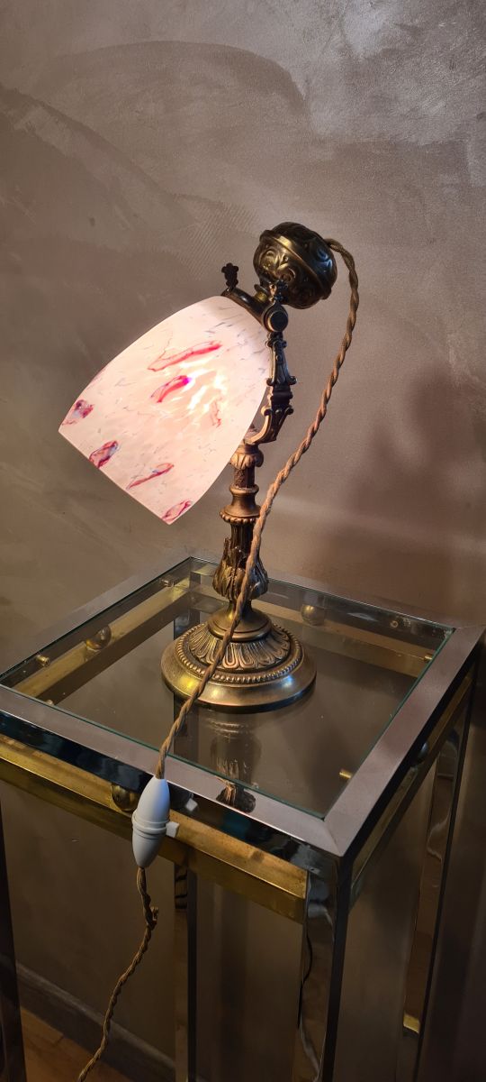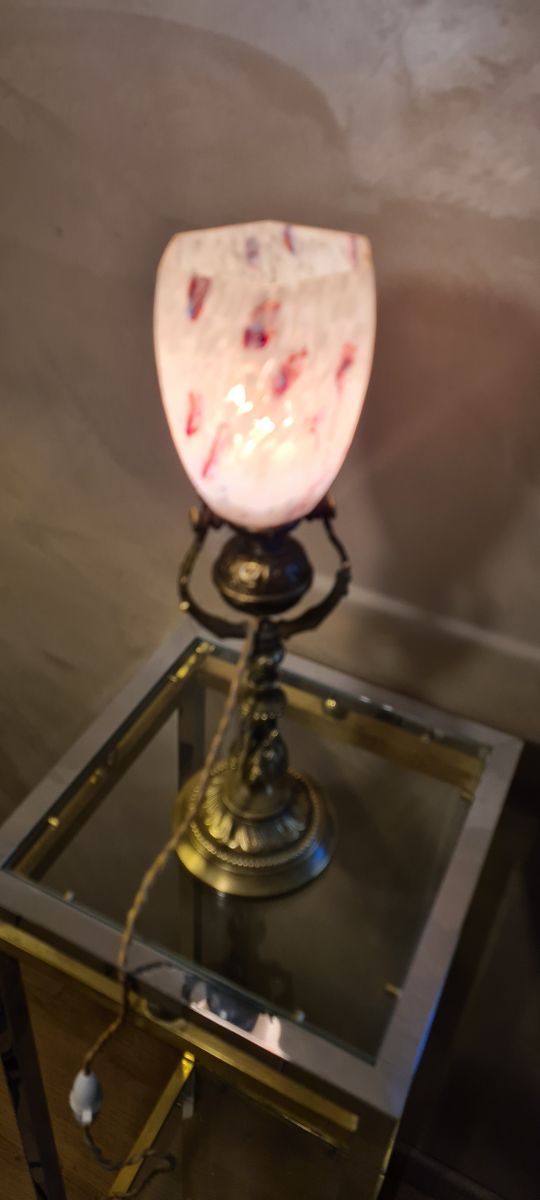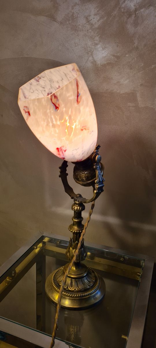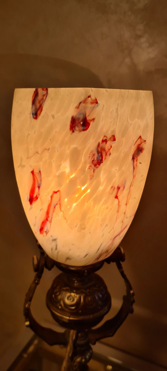 lampe bronze art nouveau , avec avec superbe tulipe moucheté ,,,articulée 28x18