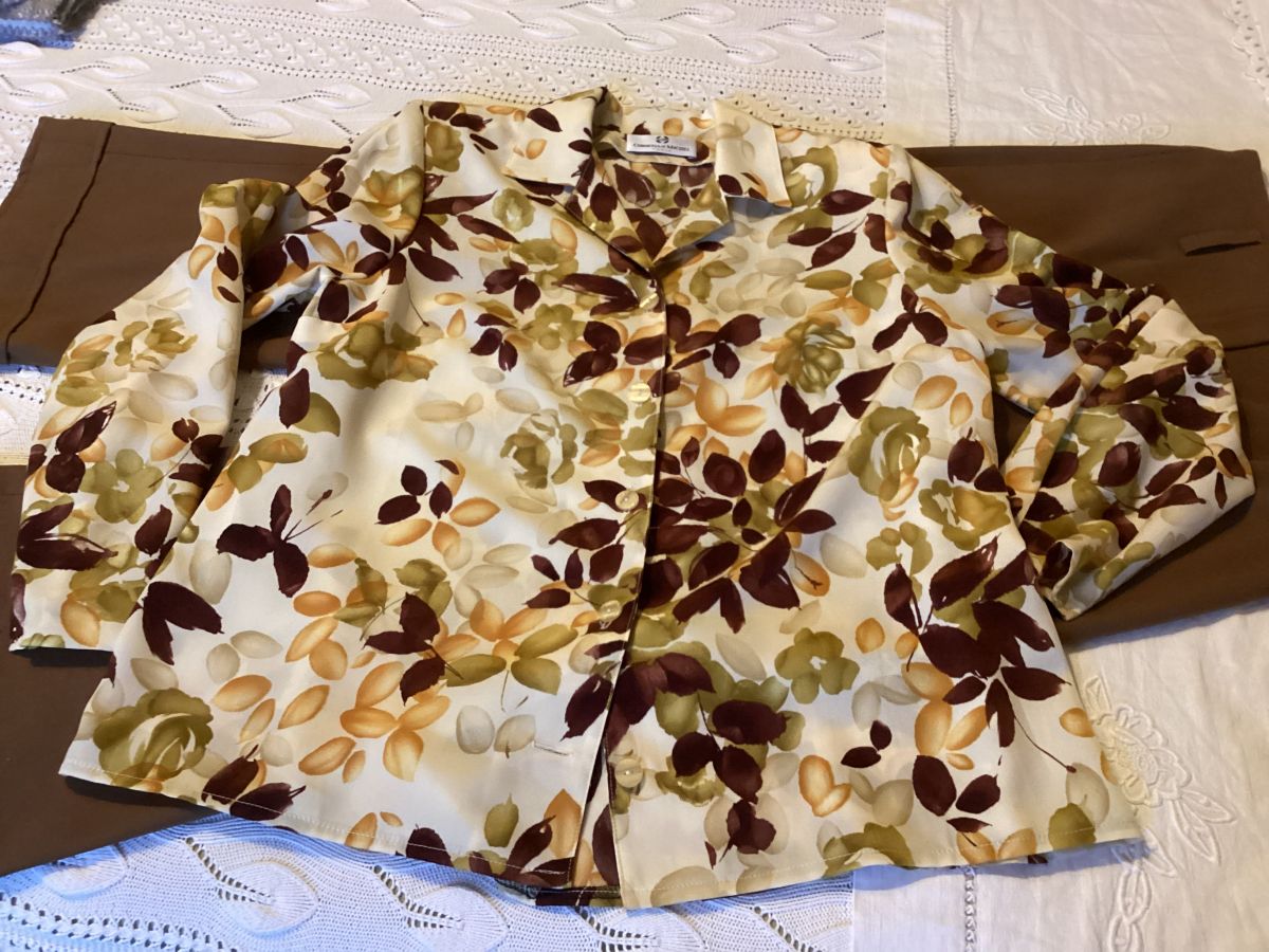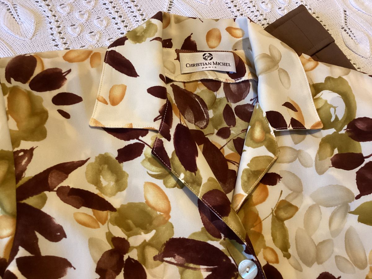 Ensemble pantalon vintage évasé ceinture à la taille marque Georges Rech taille 38 très bon état hauteur pantalon 100 cm tour de taille 40 cm bas du pantalon 27 cm mesure pris à plat chemisier imprimé floral marque Christian Michel taille M très bon état carrure 39 cm hauteur 65 cm longueur de manches 60 cm