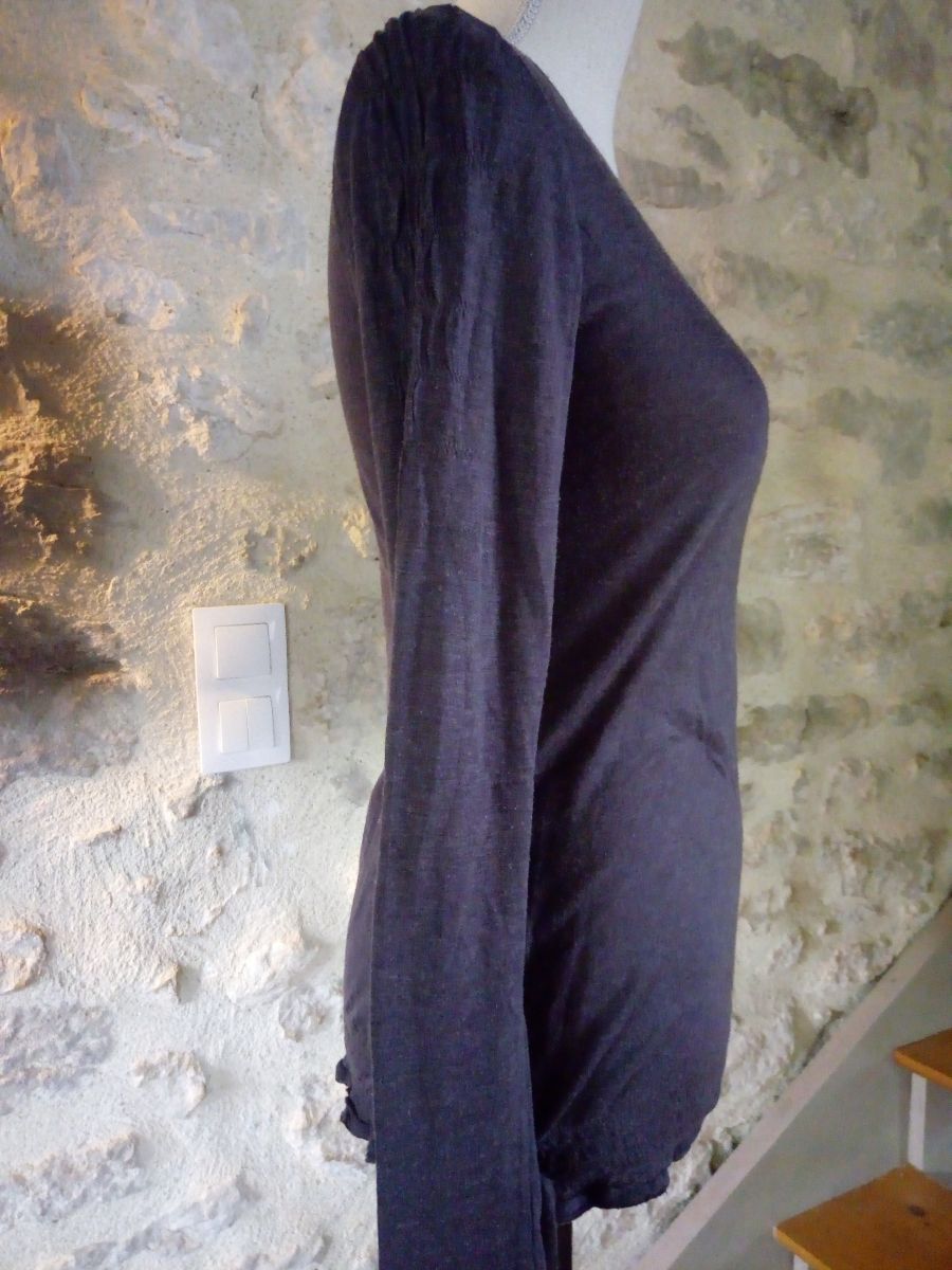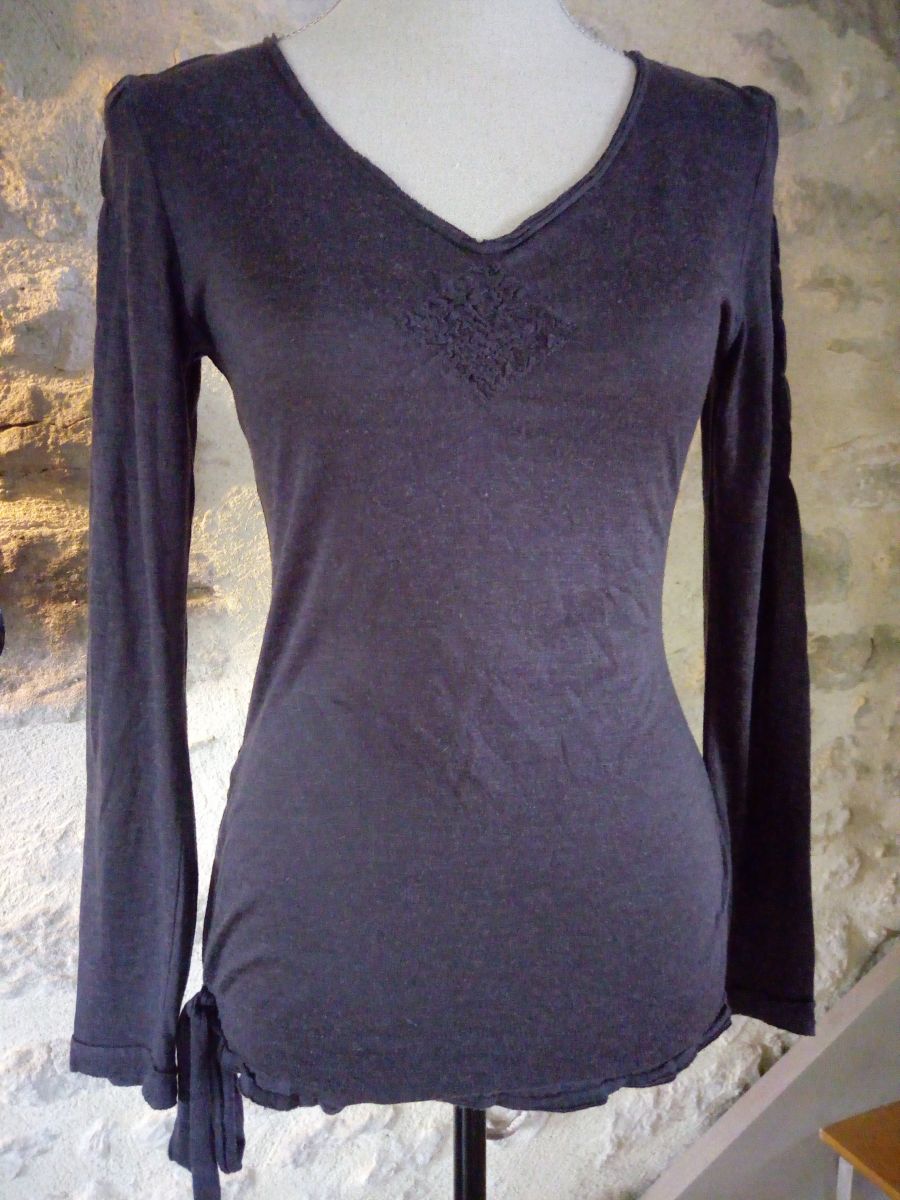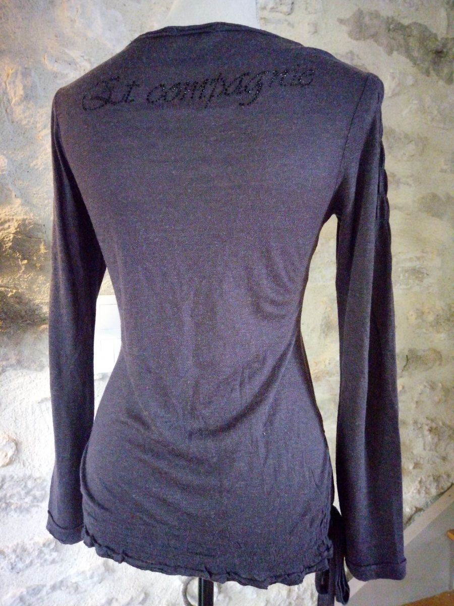 Haut "et Compagnie" élastiquée à la base pour être blousé avec nœud sur le côté, fronces en haut des manches, matière fine, très douce et assez extensible (confort+++), inscription "et compagnie" avec des strass au dos (aucun manquant).