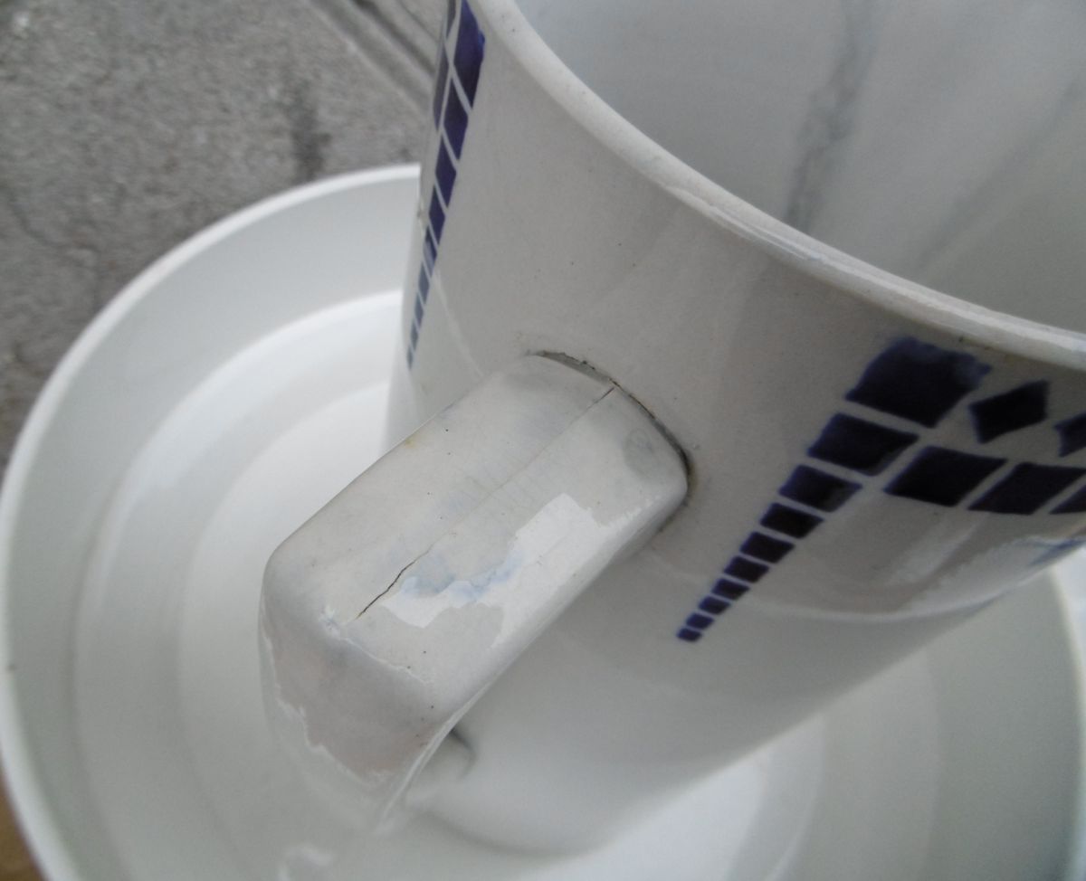 vintage 60/70s - service à toilette en céramique - modèle art déco couleur blanc et bleu marine - un grand pichet, une vasque et un repose savon