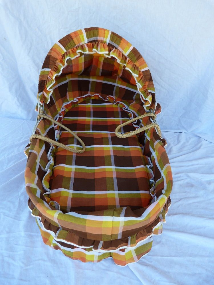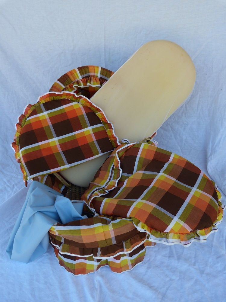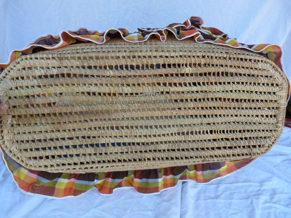 en super état ce couffin authentique vintage 70 - matière en paille tressé avec 2 poignée et tissu coton motif carreau couleur marron/jaune/vert/blanc - avec des volants sur les contours - le coussin ainsi que la mini couette son déhoussable pour le lavage - matelas mousse épaisse de 6 cm - le contour est froncé par des élastiques et s'enlèvent complètement pour le lavage - la capote se repli vers l’arrière - dimensions longueur 87 cm largeur 55 cm hauteur minimum 36 cm max 57 cm