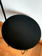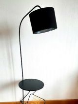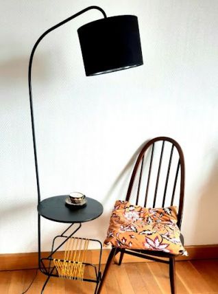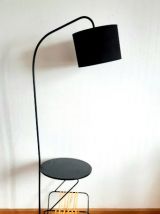 Lampadaire à structure tubulaire en métal laqué noir, faisant porte-revues à son pied en scoubidou de couleur jaune. Tablette en bois repeinte en noir.