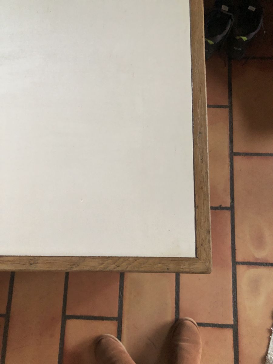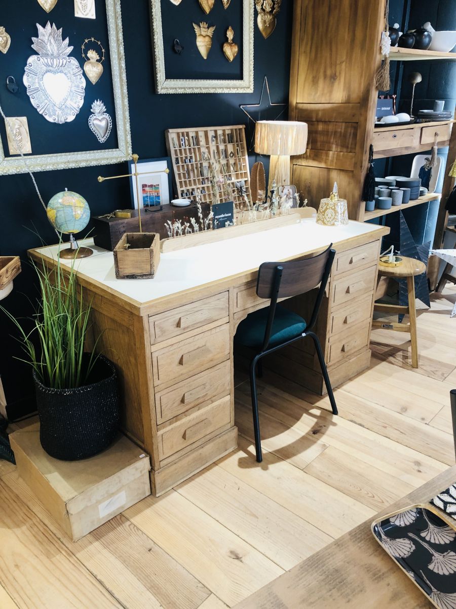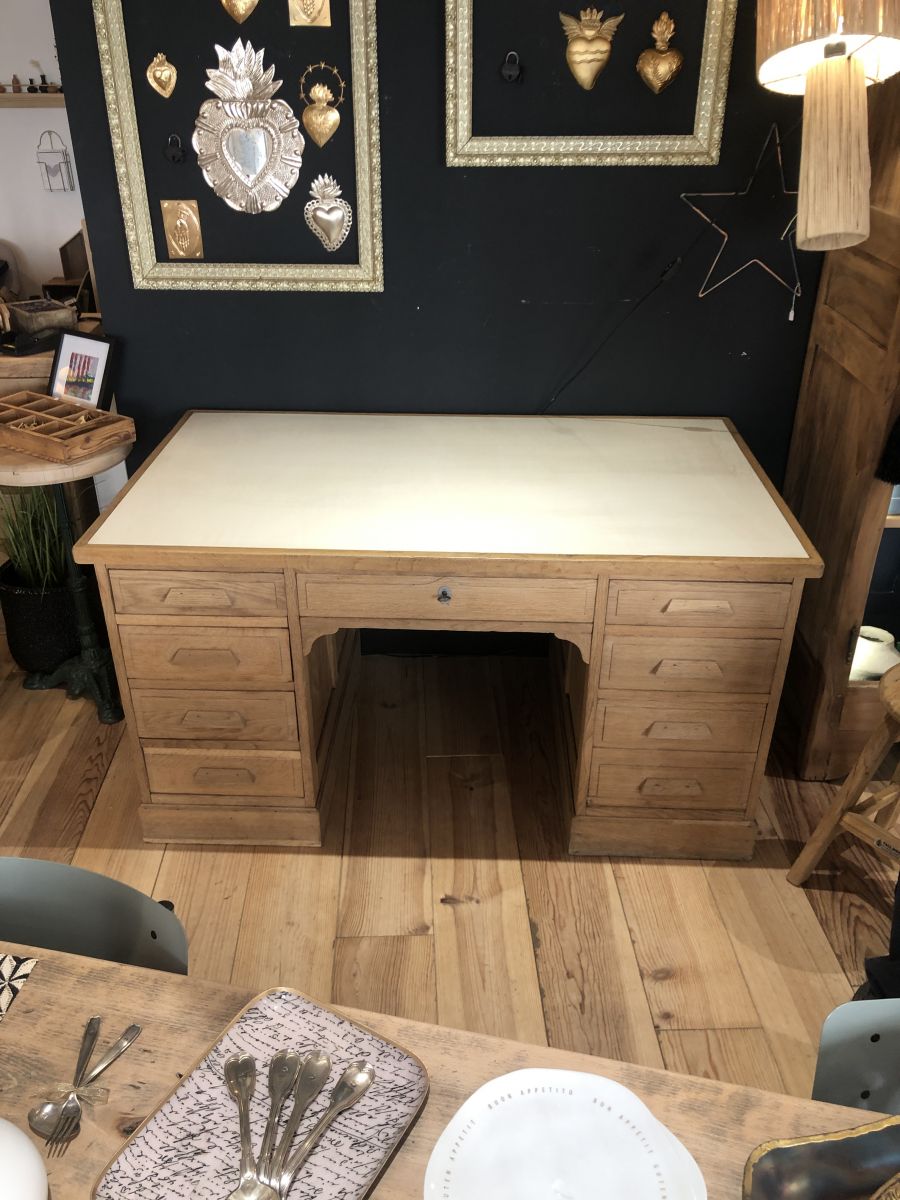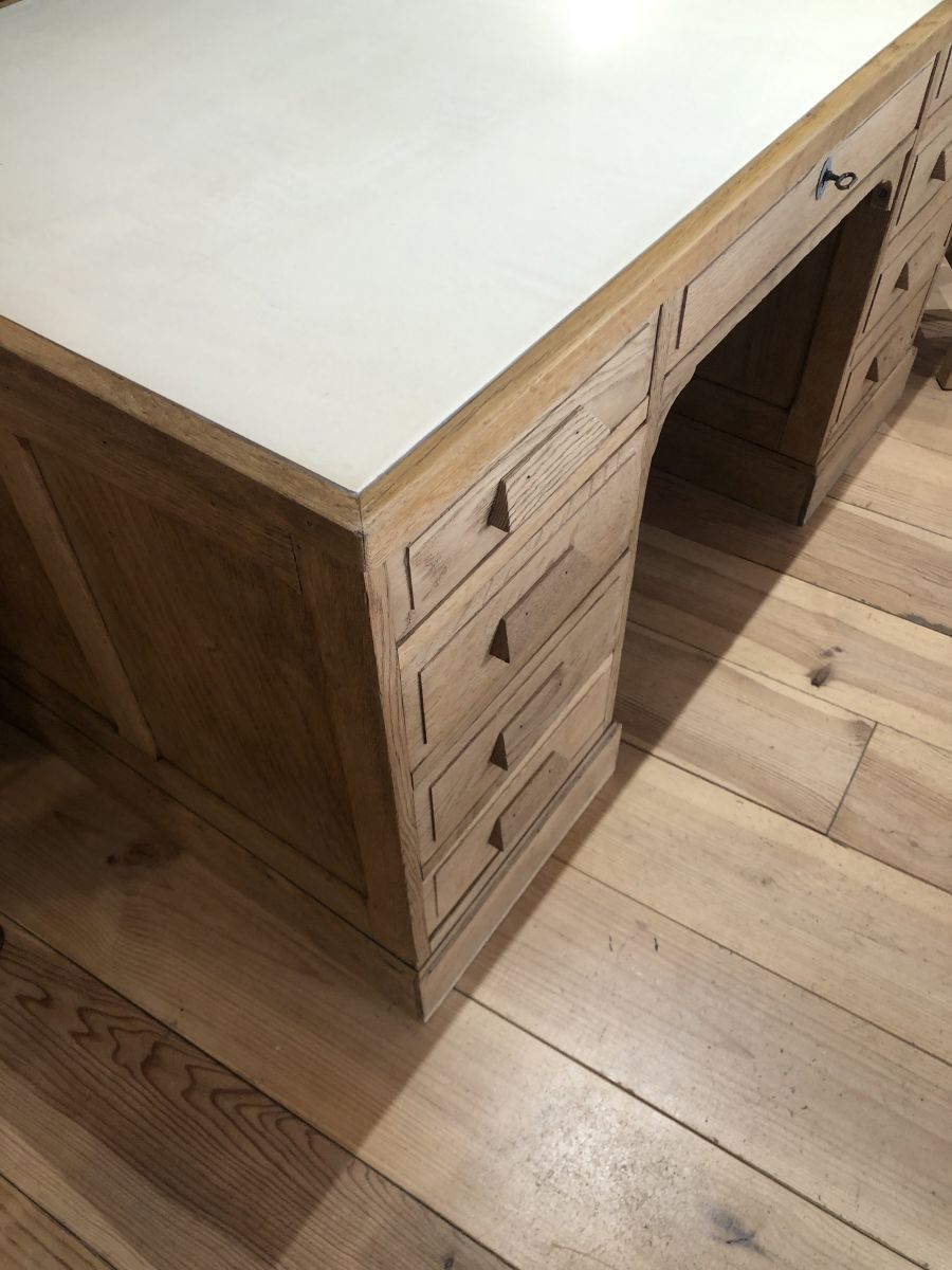 Bureau administratif dit américain a tiroirs. En bas a gauche tiroirs double. Bureau entièrement sablé et plateau rénové.