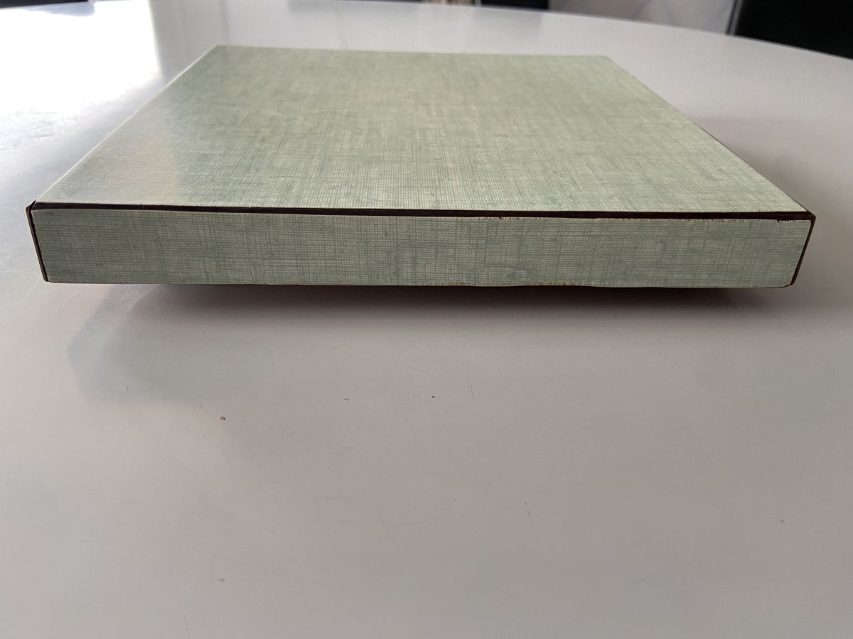 Dessous de plat carré en formica vert clair des années 60, dimensions (cm) : L.22xH.22xP.2, bon état.