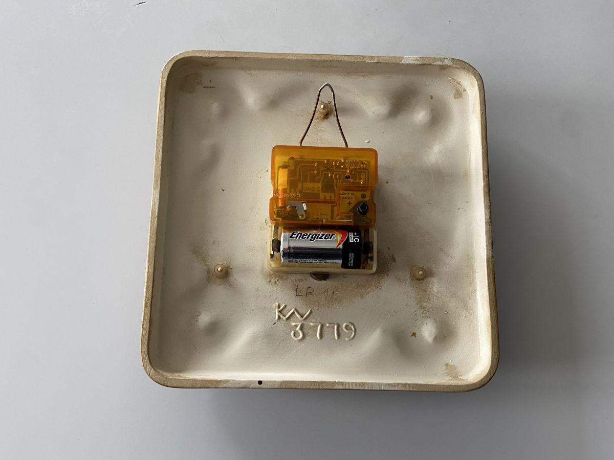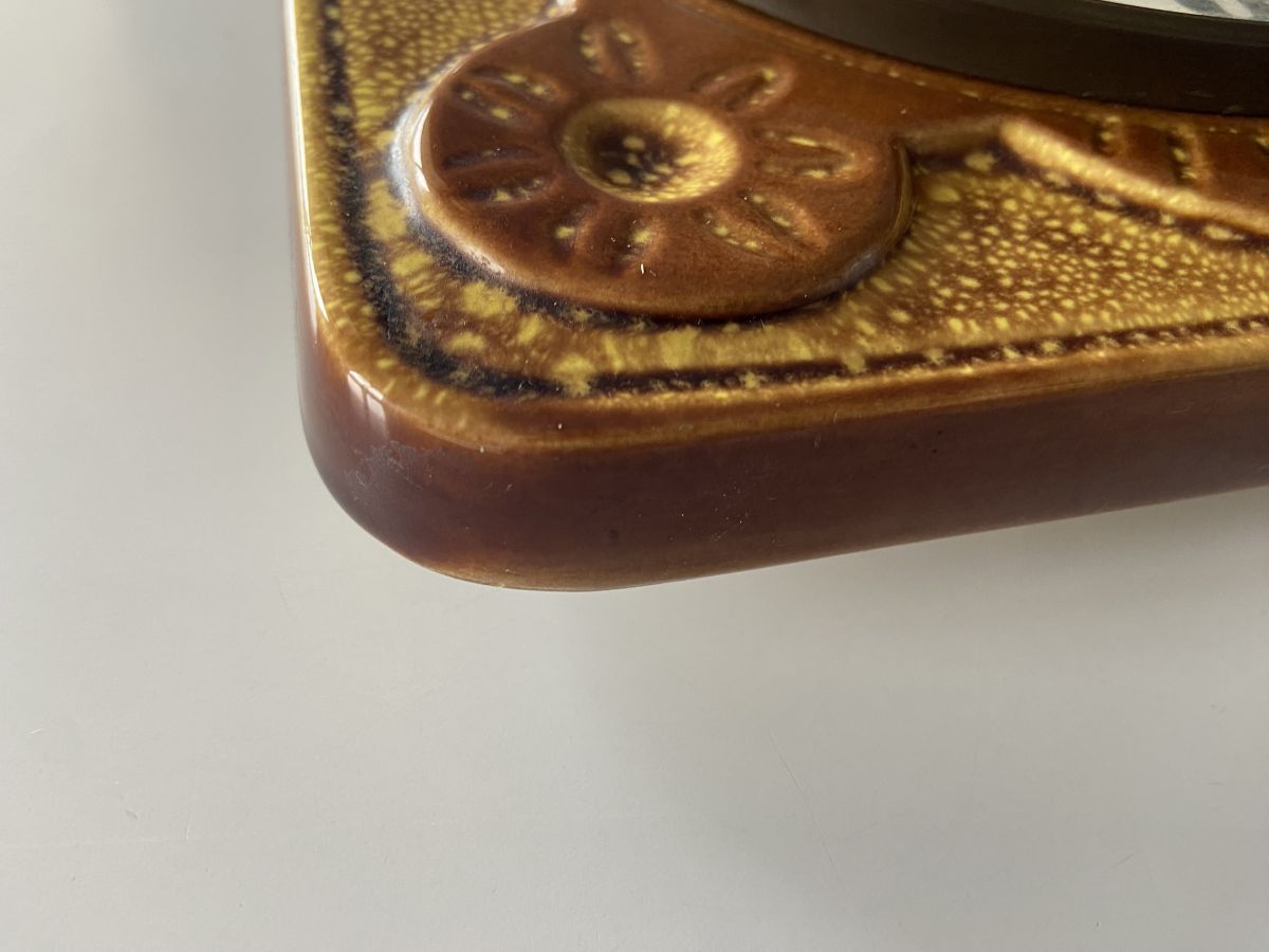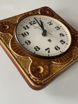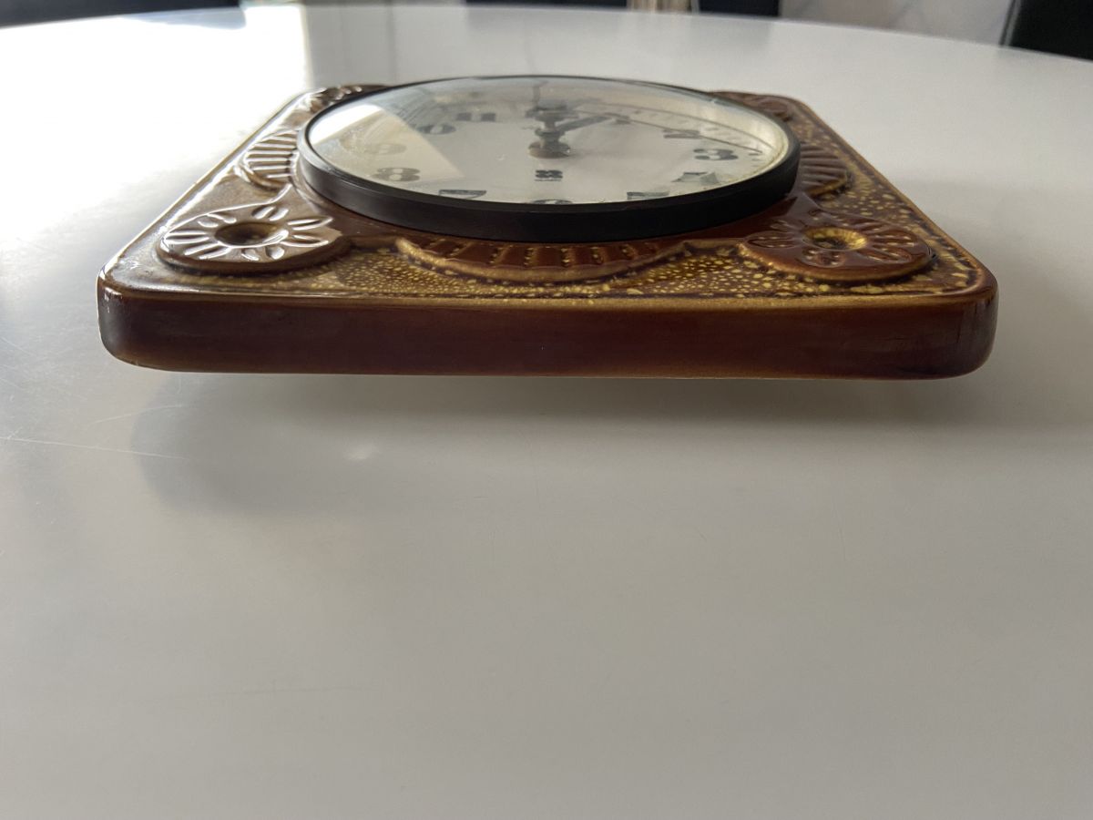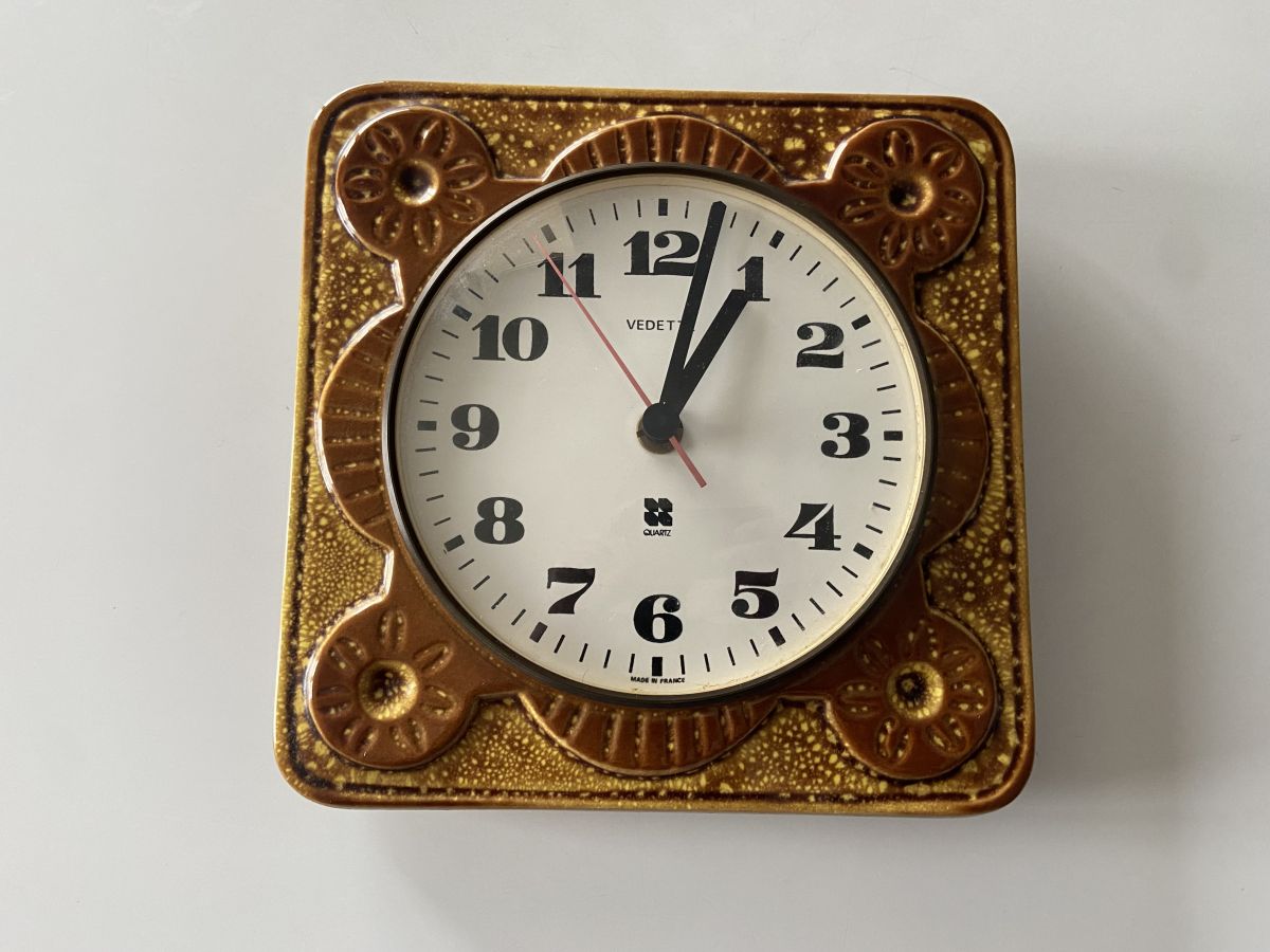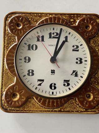 Horloge murale en céramique des années 70 de la marque Vedette, mécanisme à quartz, dimensions (cm) : L.21xH.21xP.2, bon état.
