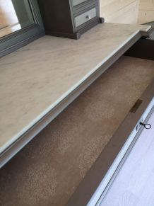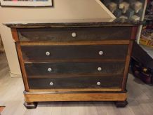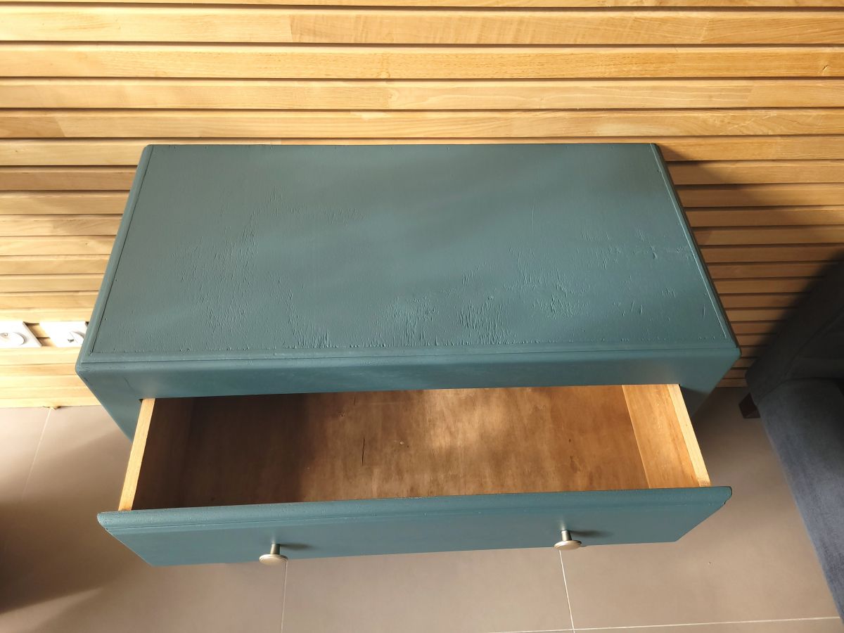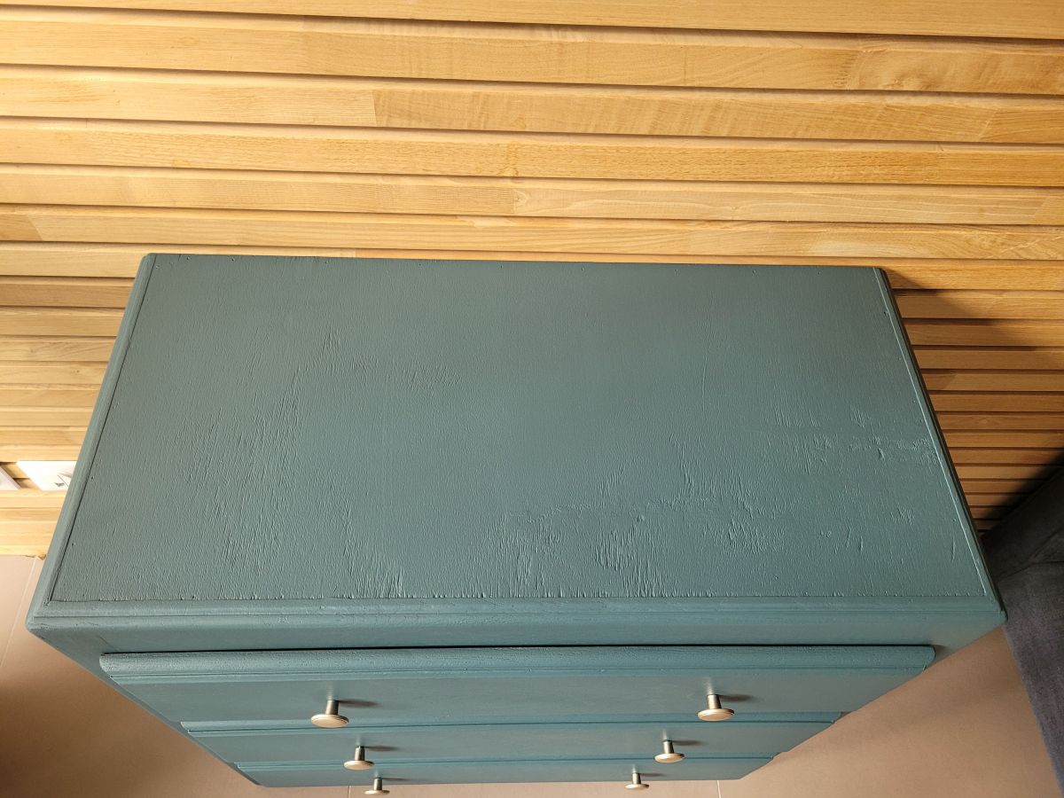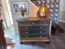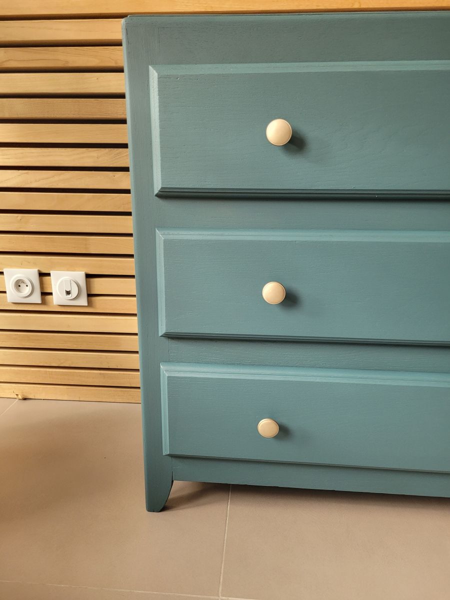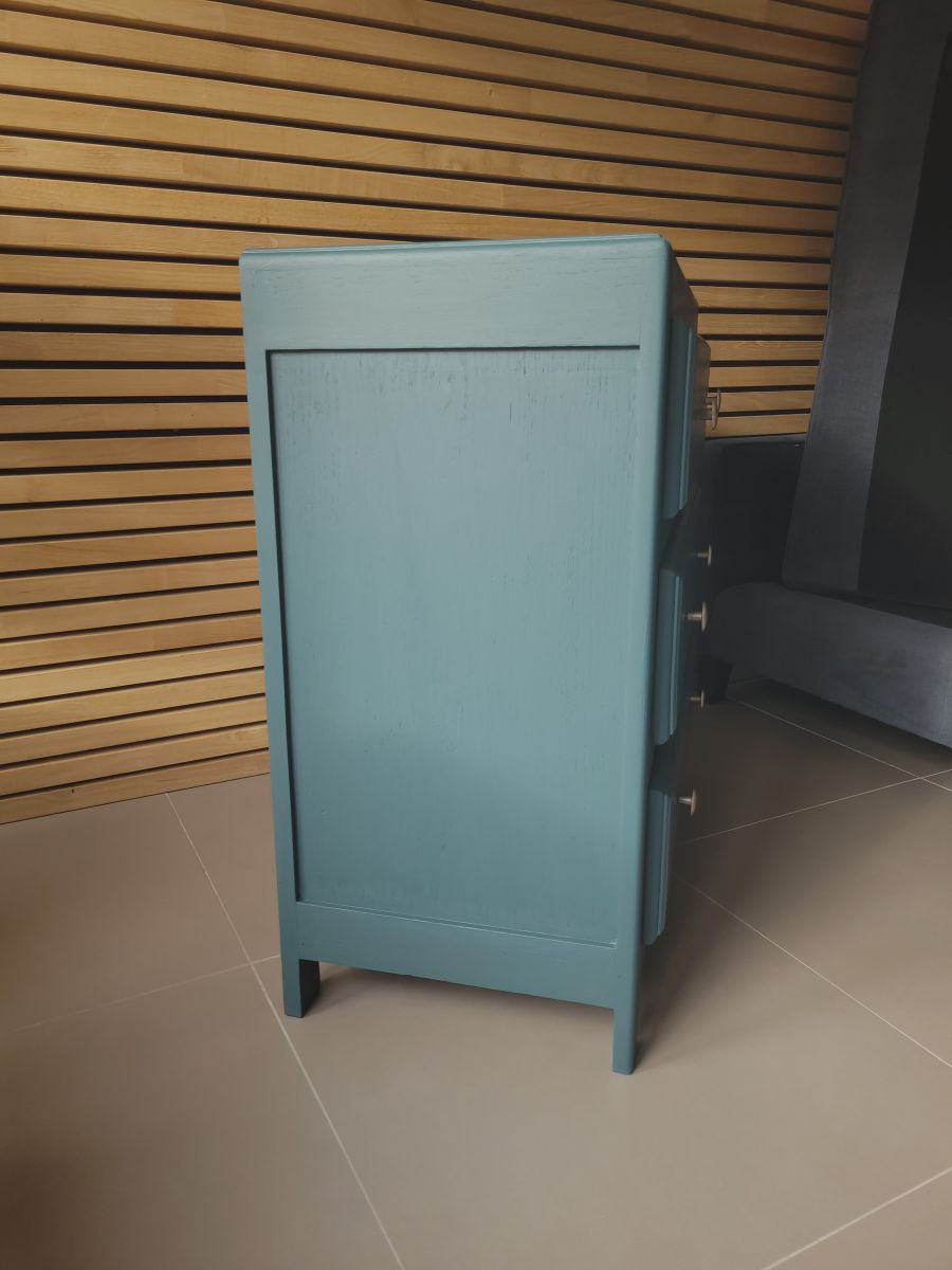 Commode parisienne vintage des années 60 en bois massif. Elle a été entièrement restaurée: nettoyée, poncée repeinte dans la couleur "London" de chez ressource (satin velouté). La commode est en très bon état, Les veines du bois sont plus creusées sur le plateau (voir photos). Les boutons de tiroirs sont d'origine. Le meuble est sain, stable et propre. Les tiroirs coulissent parfaitement.