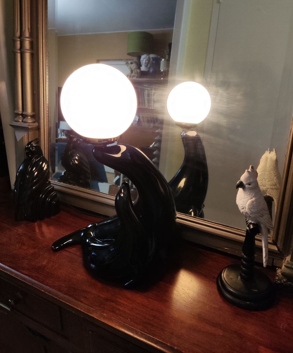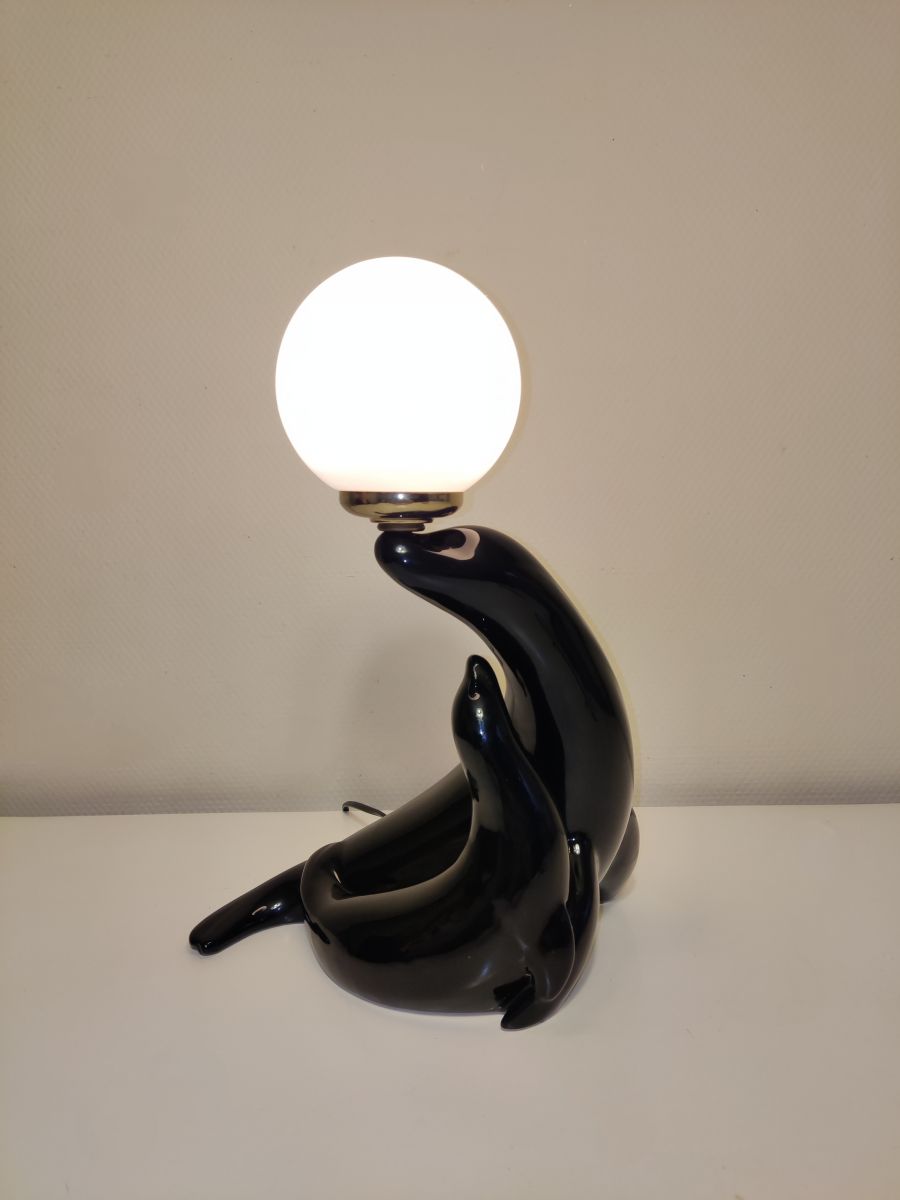 lampe otarie avec son petit en céramique noire et globe en opaline blanche