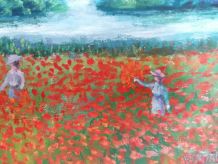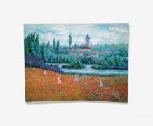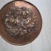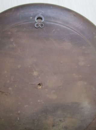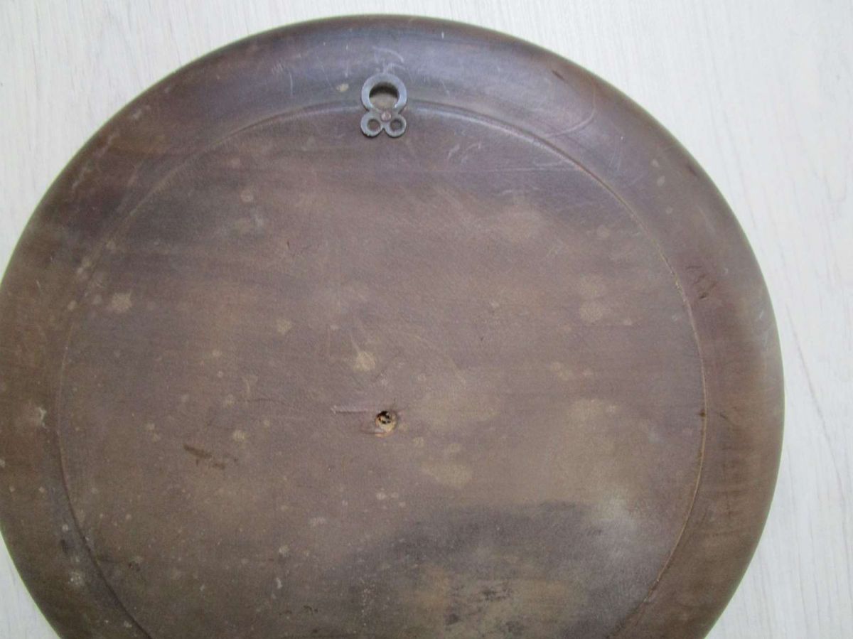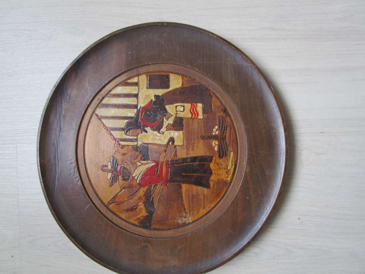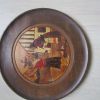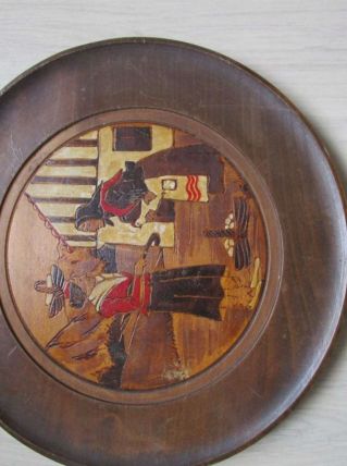 Assiette de décoration en bois gravé et peint. Système d'accrochage.