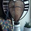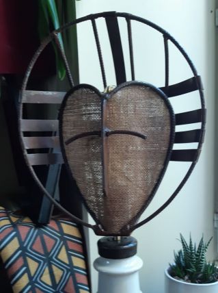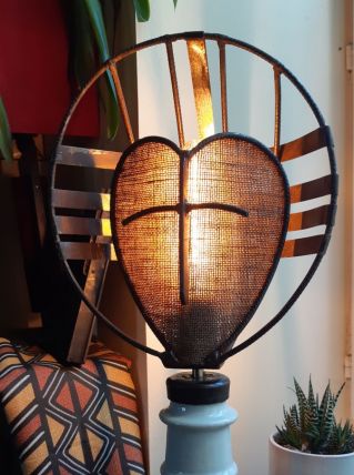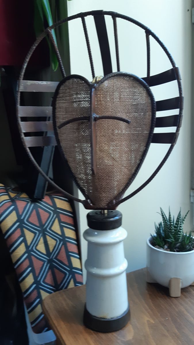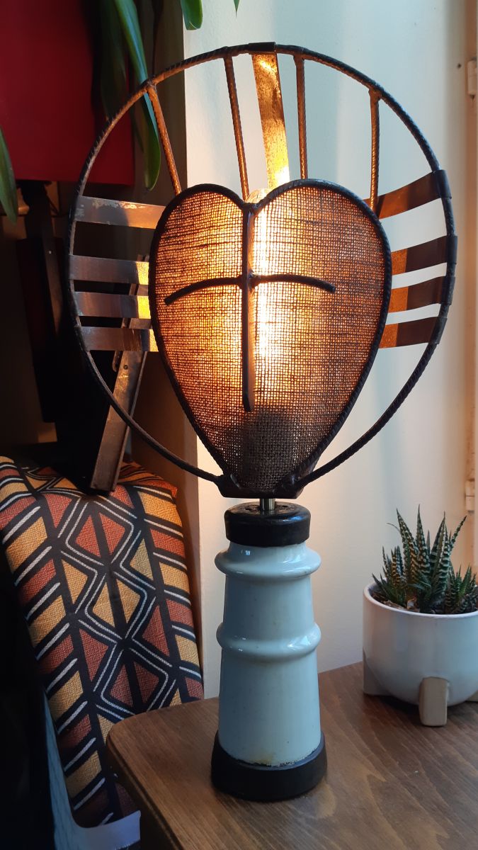 Création originale (DIY), le pied de la lampe est composé d'un isolateur en porcelaine vintage (années 60), le style de la partie supérieure s' inspire de l'art africain (masque Fang du Cameroun). Tous les matériaux, exceptée la partie électrique, sont issus de la récupération .