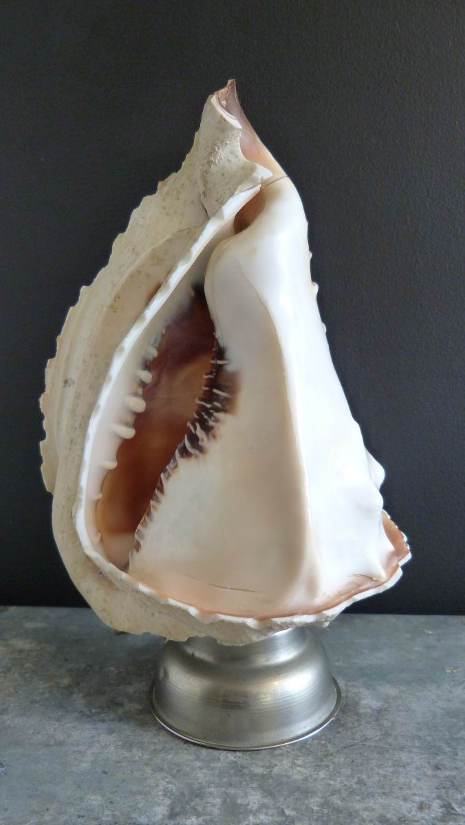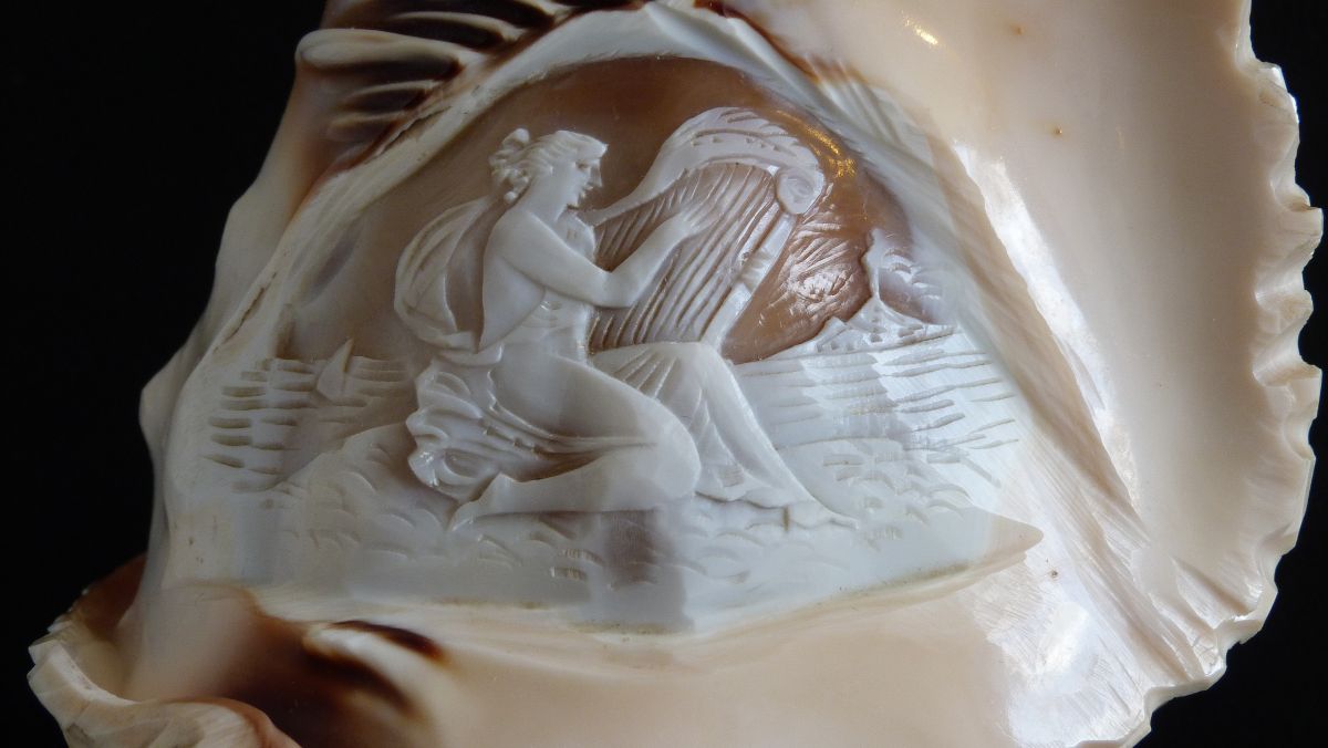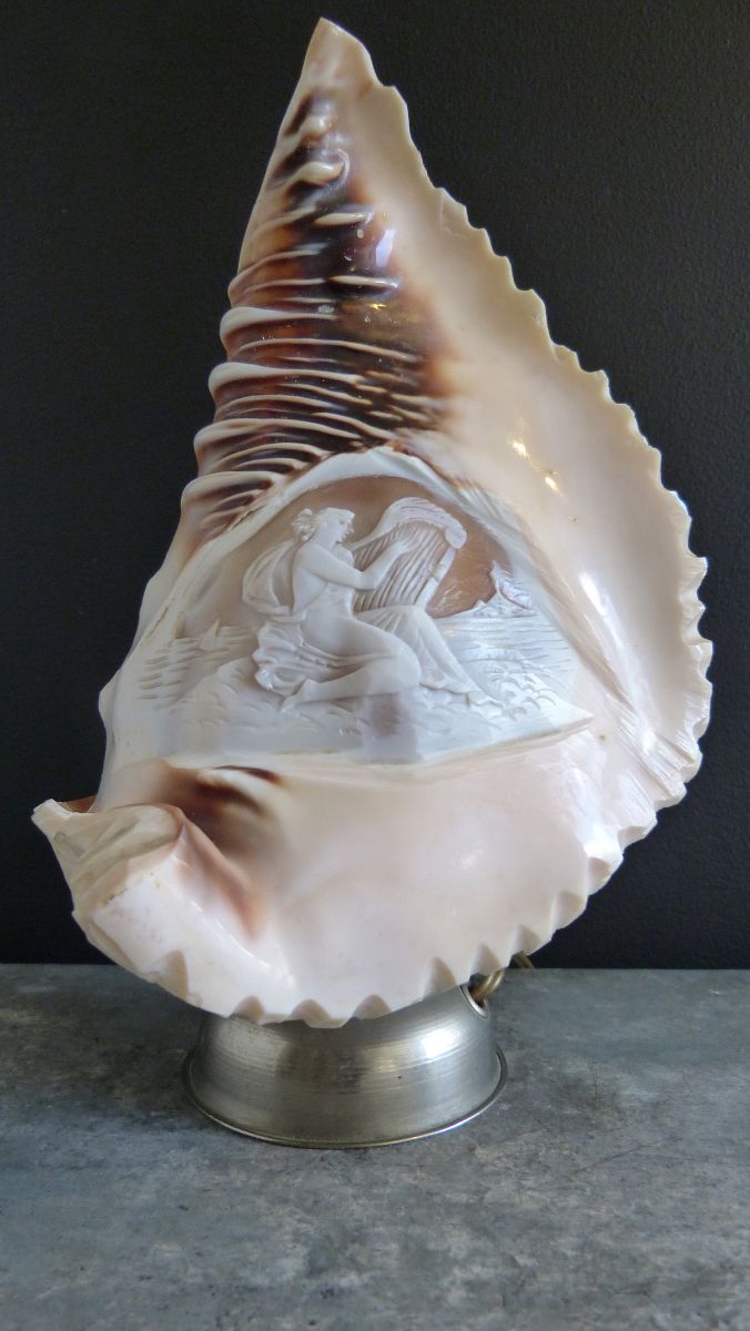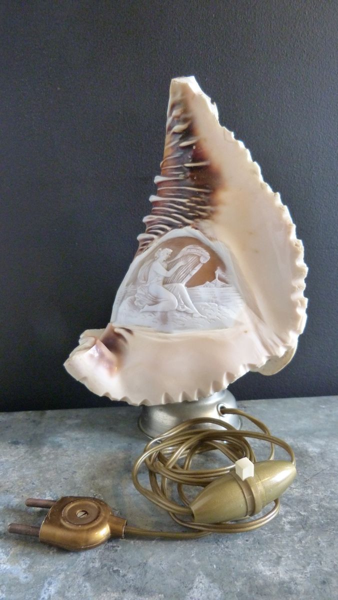 Coquillage sculpté façon camée d'une scène mythologique (Muse Erato jouant de la lyre - baie de Naples, Vésuve) et monté en lampe.