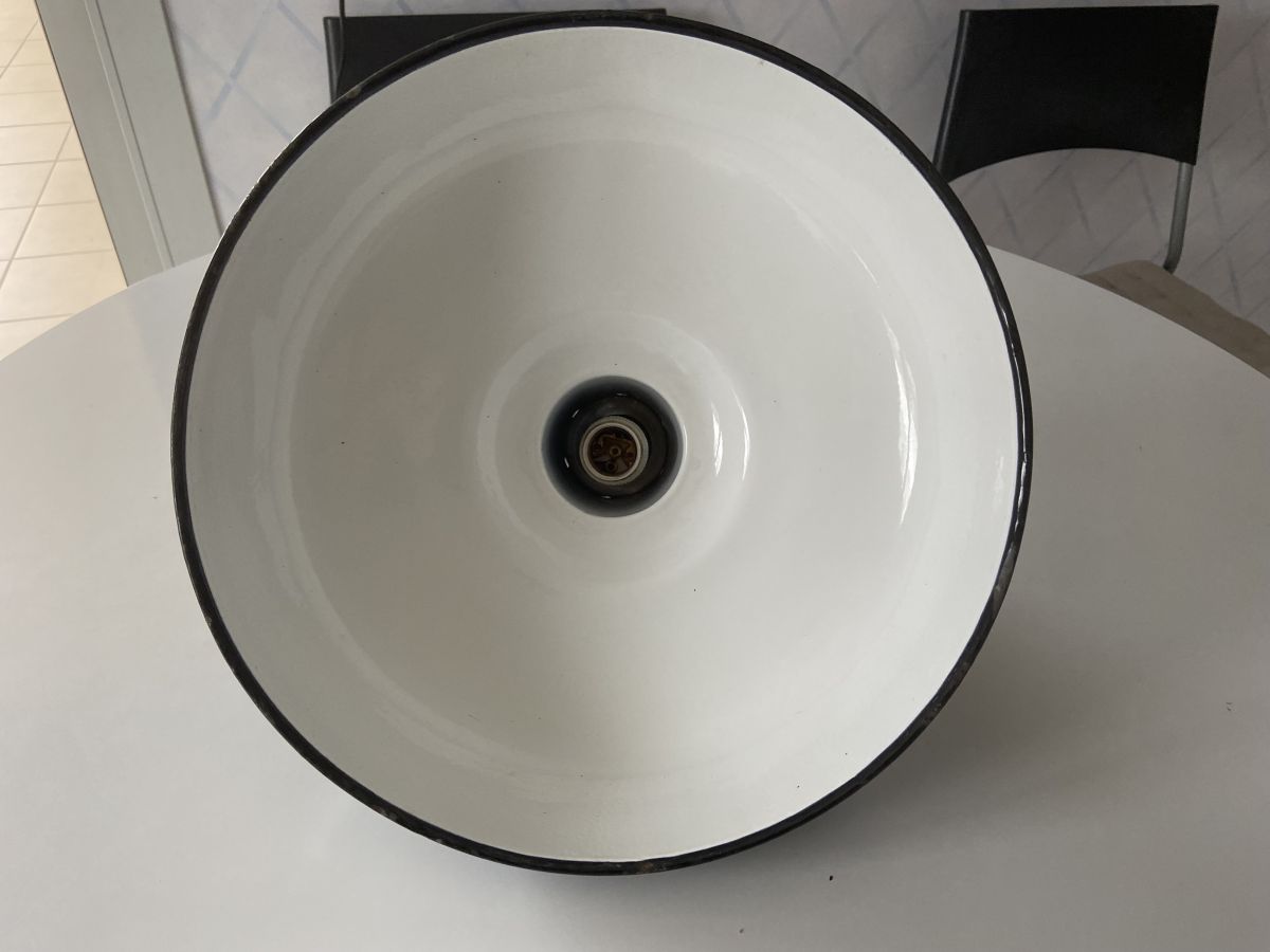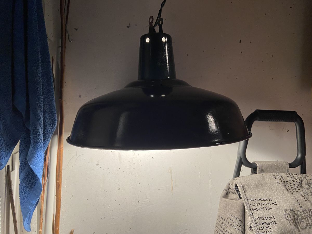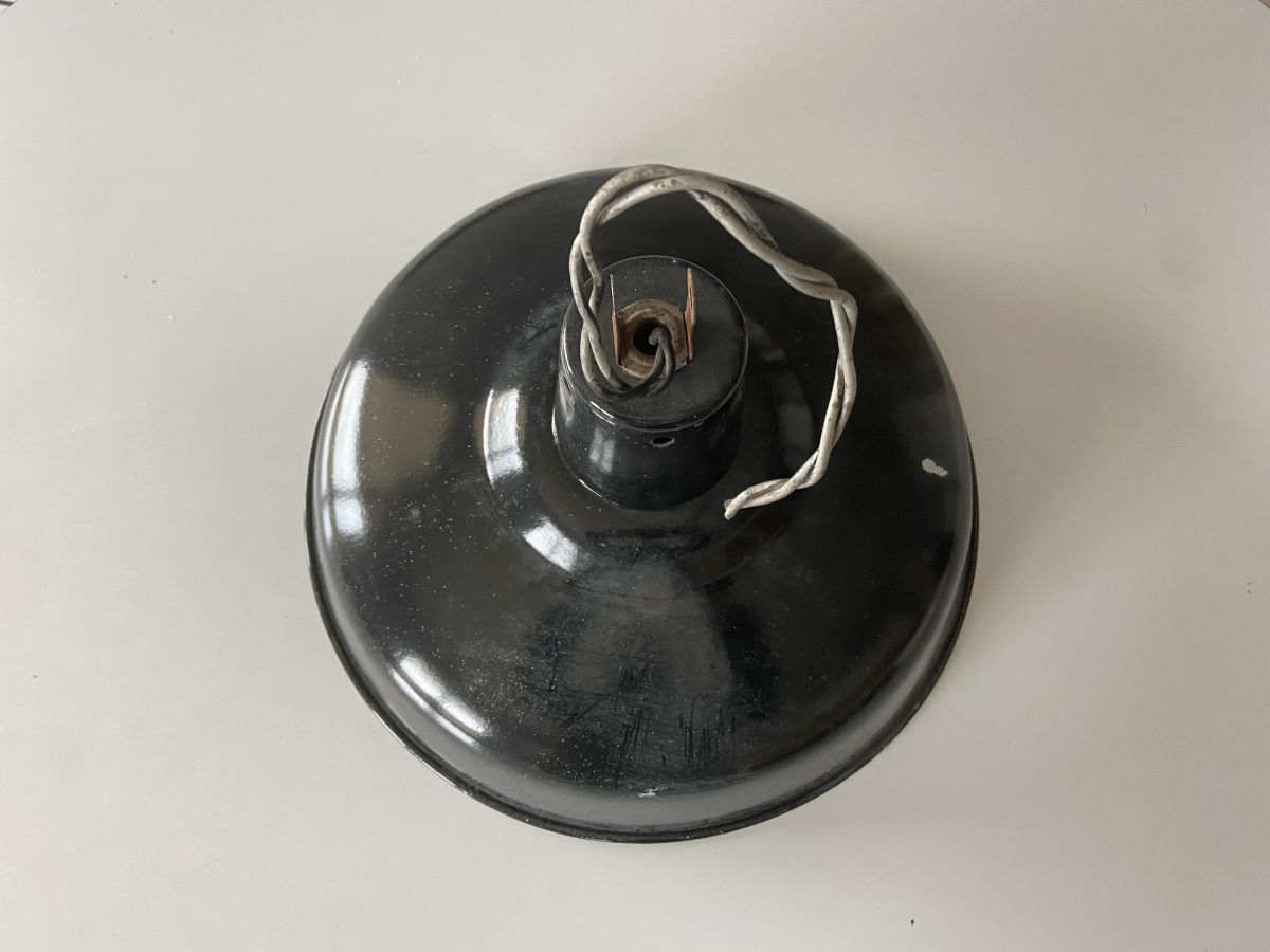 Suspension industrielle des années 50 en tôle émaillée noire, ampoule vissée E27, quelques traces du temps (voir photos), fonctionne parfaitement, hauteur 20cm, diamètre 35cm, bon état.