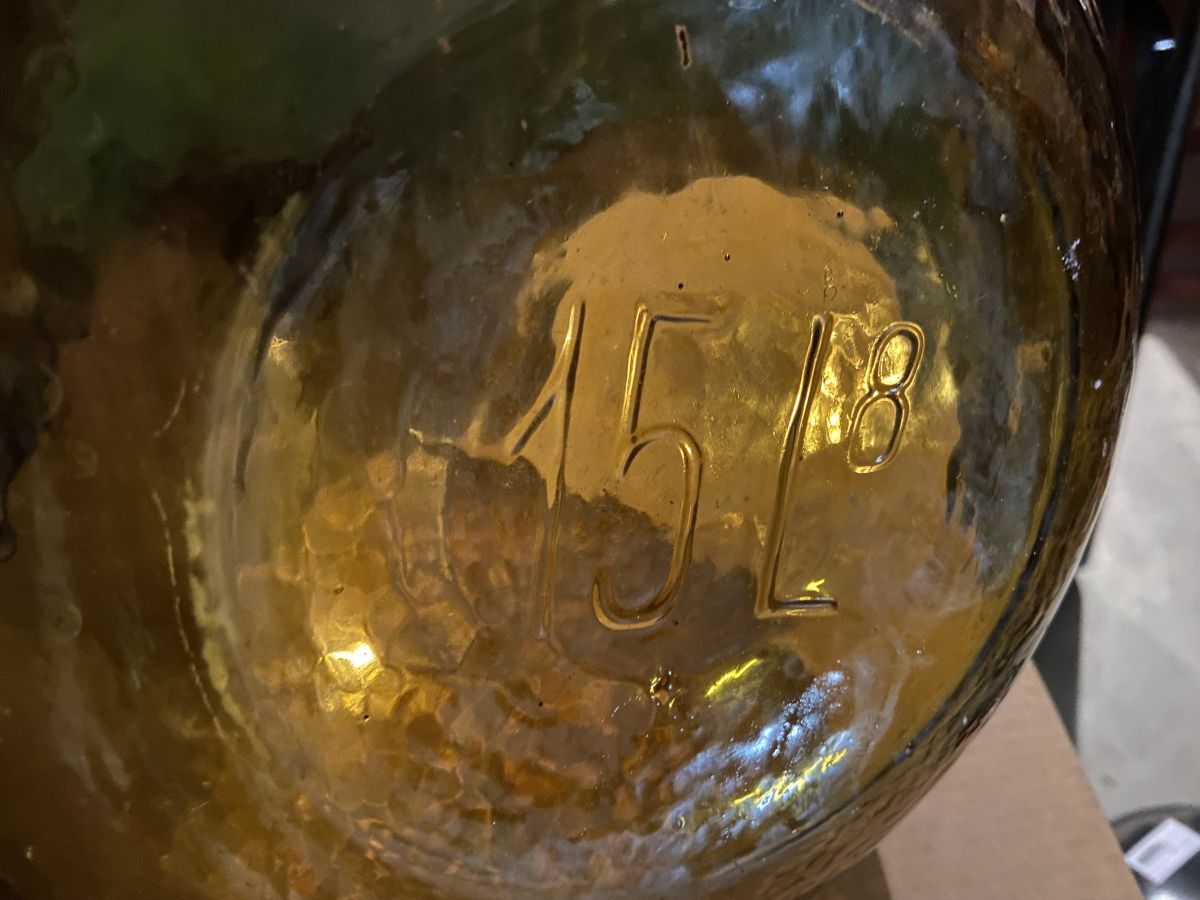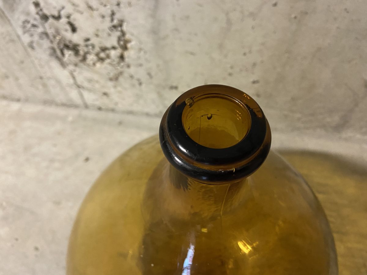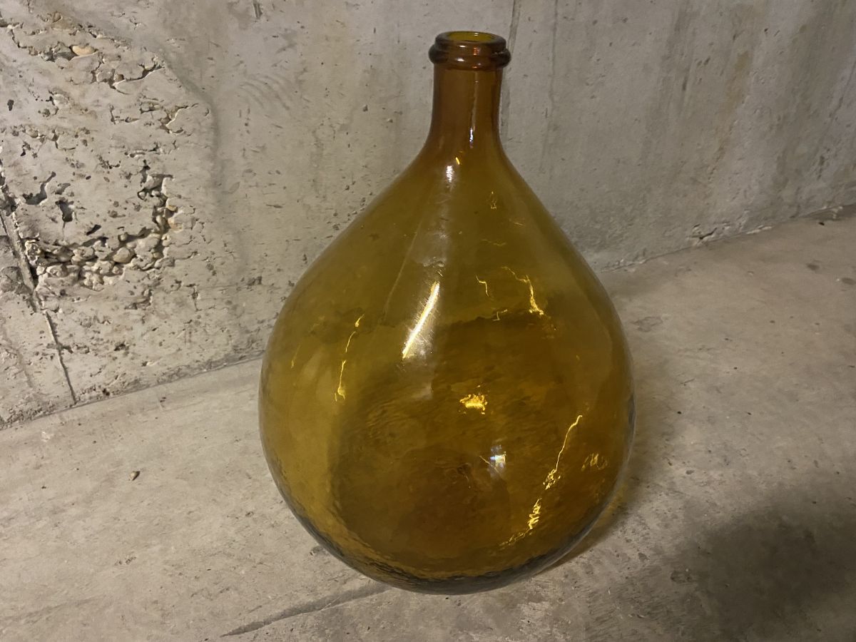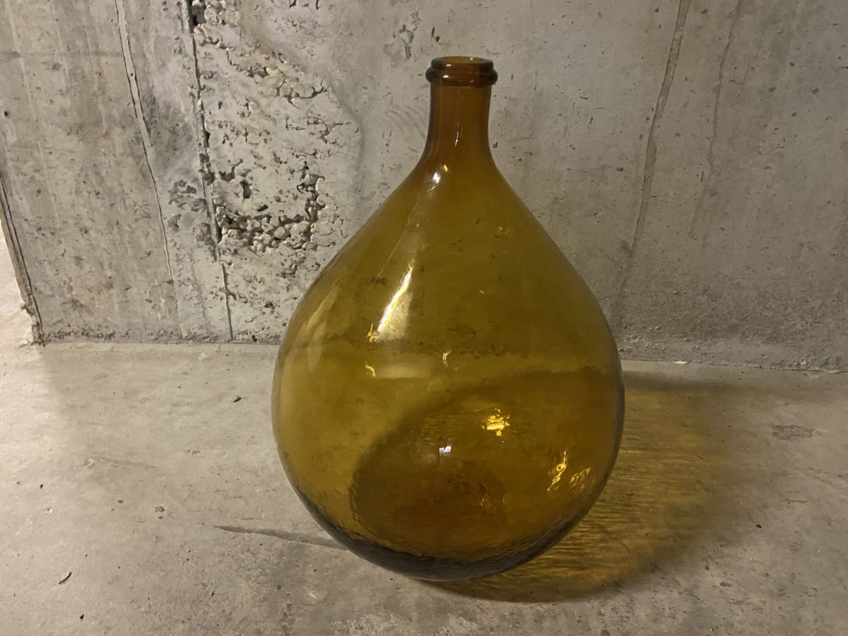 Dame Jeanne ambrée des années 50, contenance 15L, soufflée d’un seule tenant (sans couture), hauteur 41cm, diamètre 27cm, bon état.