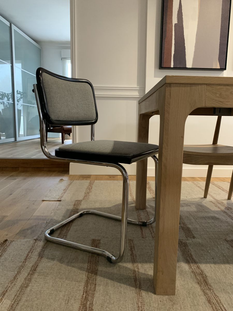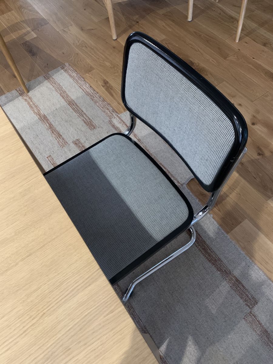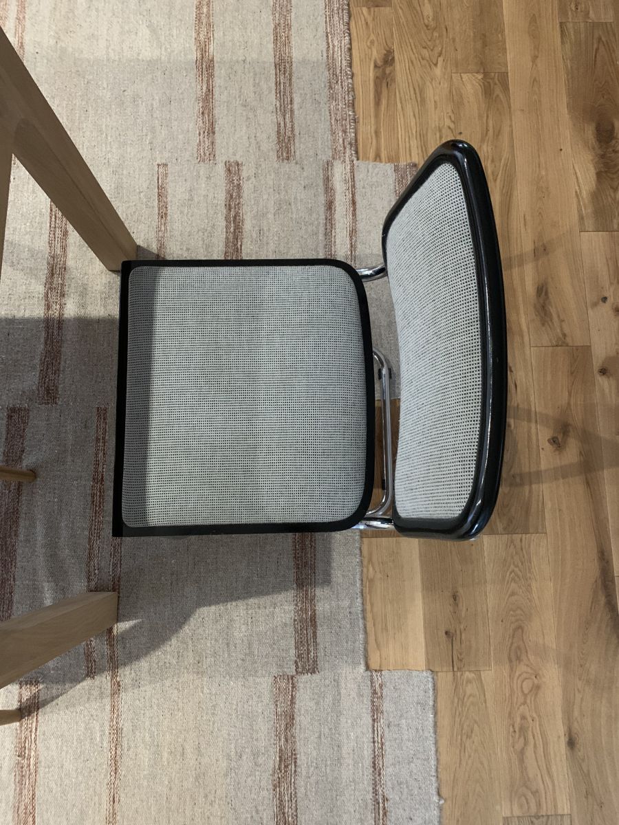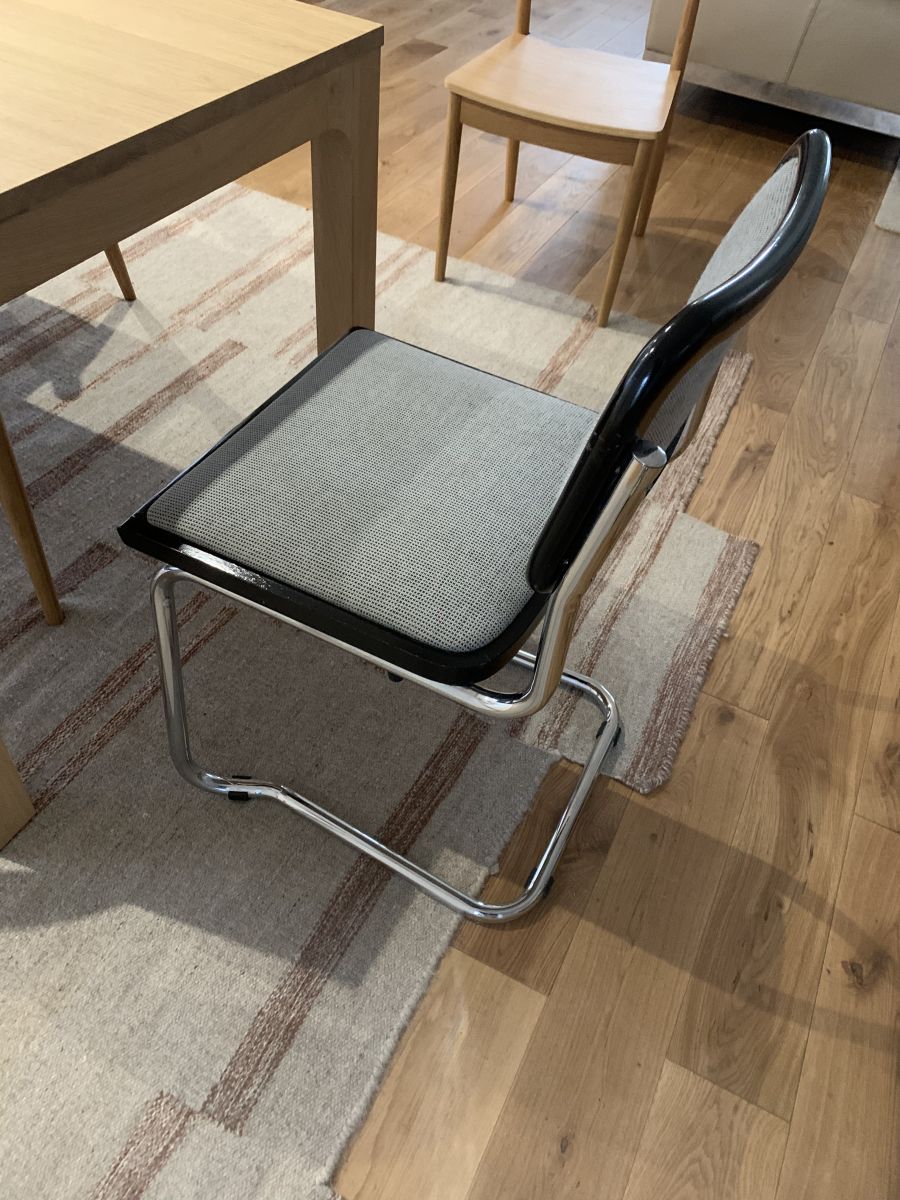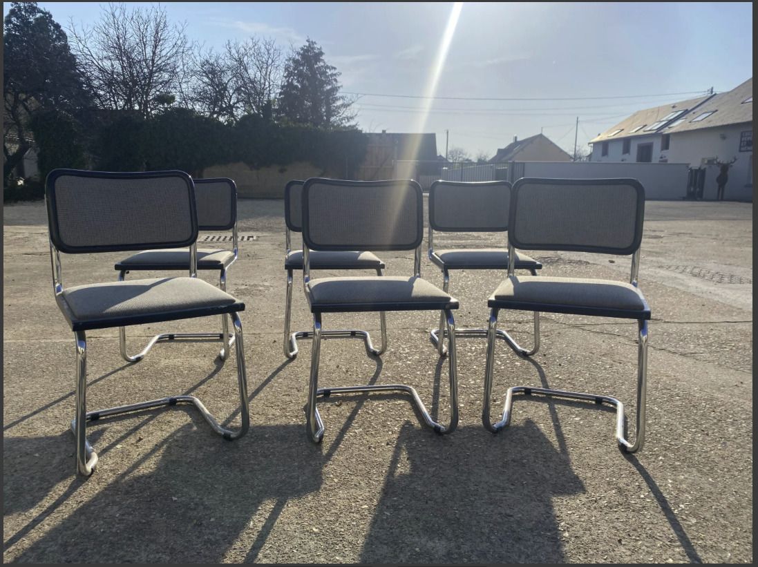 Suite de 6 chaises modèle " CESCA " en métal chromé tubulaire et bois laqué noir. Garnitures de tissus gris chiné.