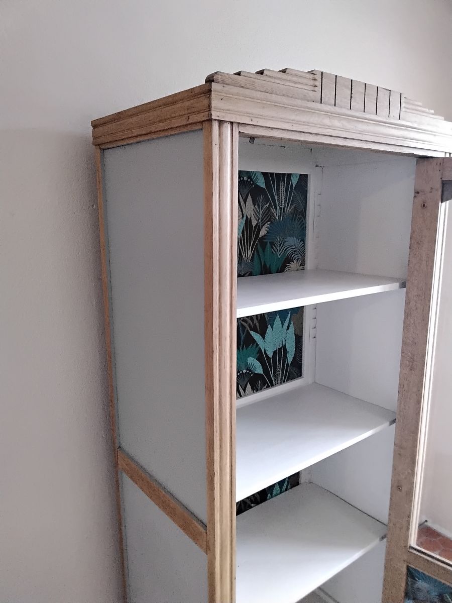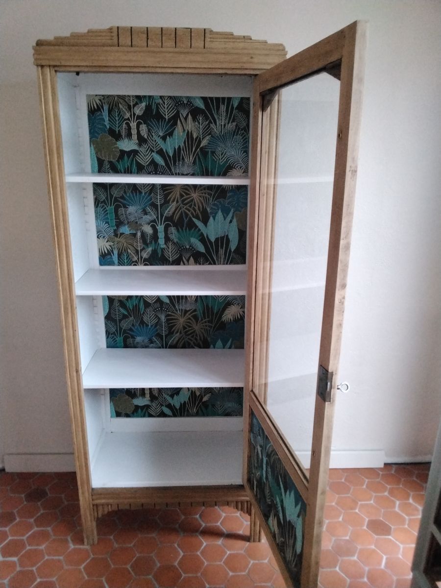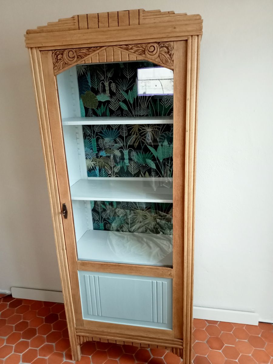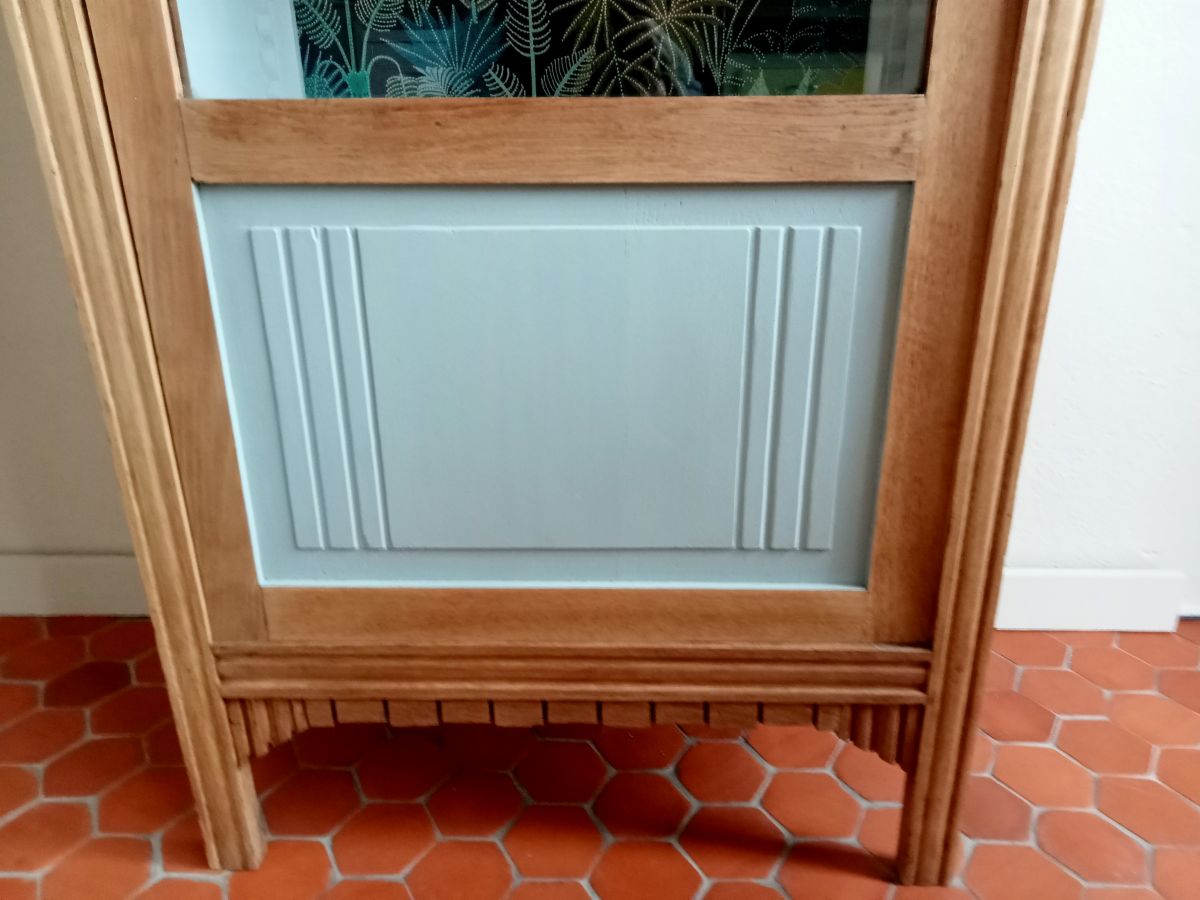 Armoire vitrine art déco entièrement relookée avec soins,peinture verte eucalyptus et vernis mat profond.