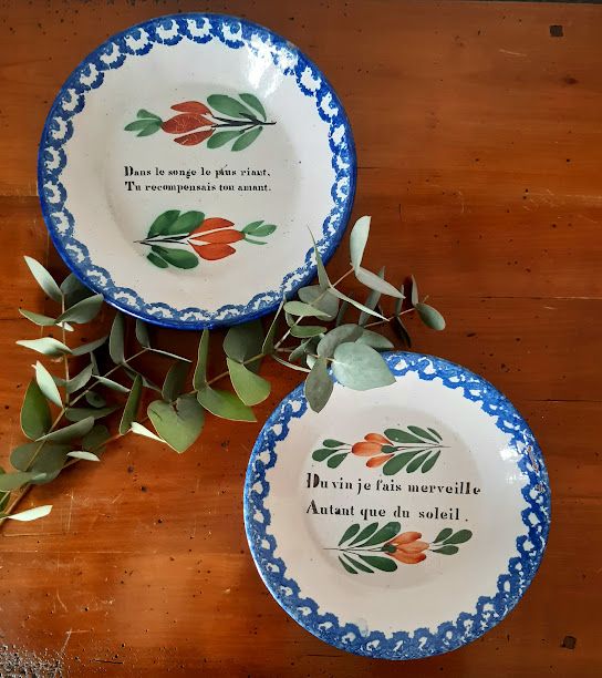 Paire d'assiettes creuses dites "bavardes" comportant chacune en son centre une inscription :