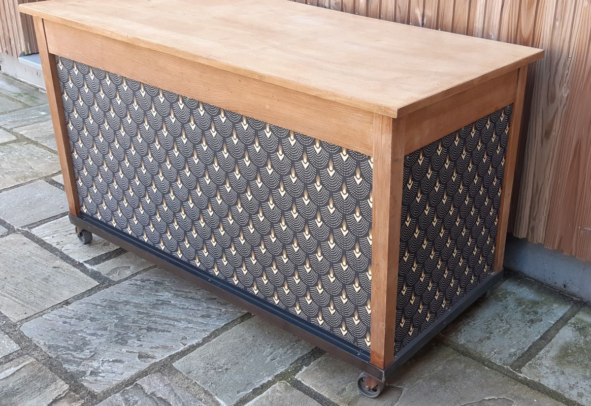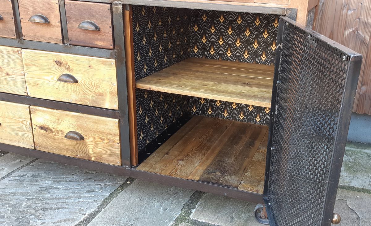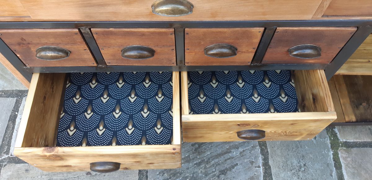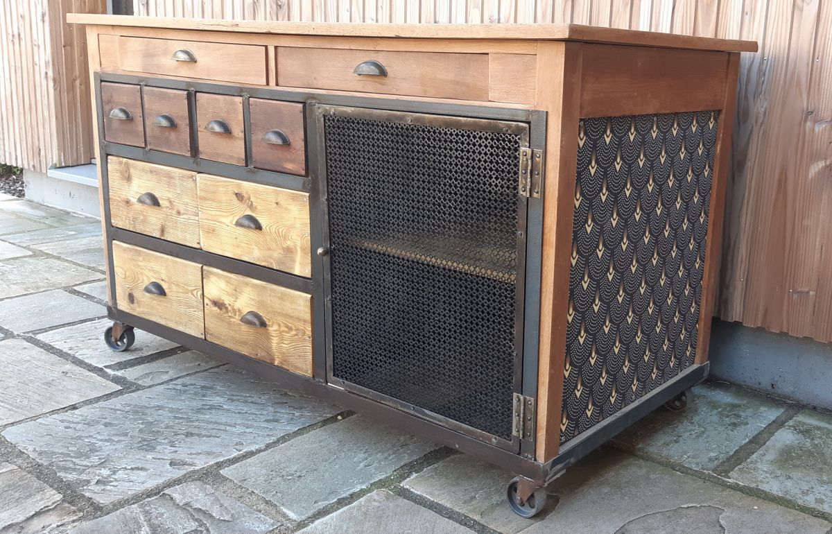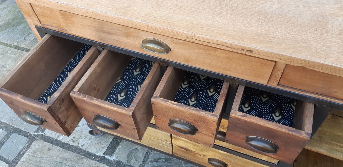 Une simple table peut se transformer en un superbe meuble de métier. Principalement conçu à partir de matériaux récupérés : la porte est une ancienne grille de cheminée, les tiroirs et caissons sont fait de voliges, les poignées sont en laiton ancien. Ce meuble à roulette peut aussi servir d'ilot pour une cuisine atypique.