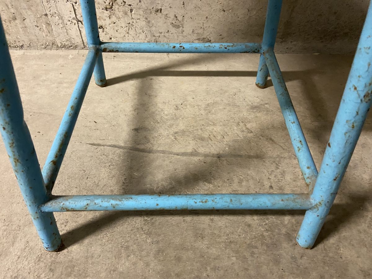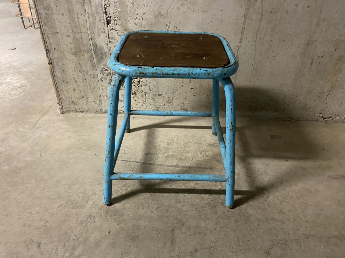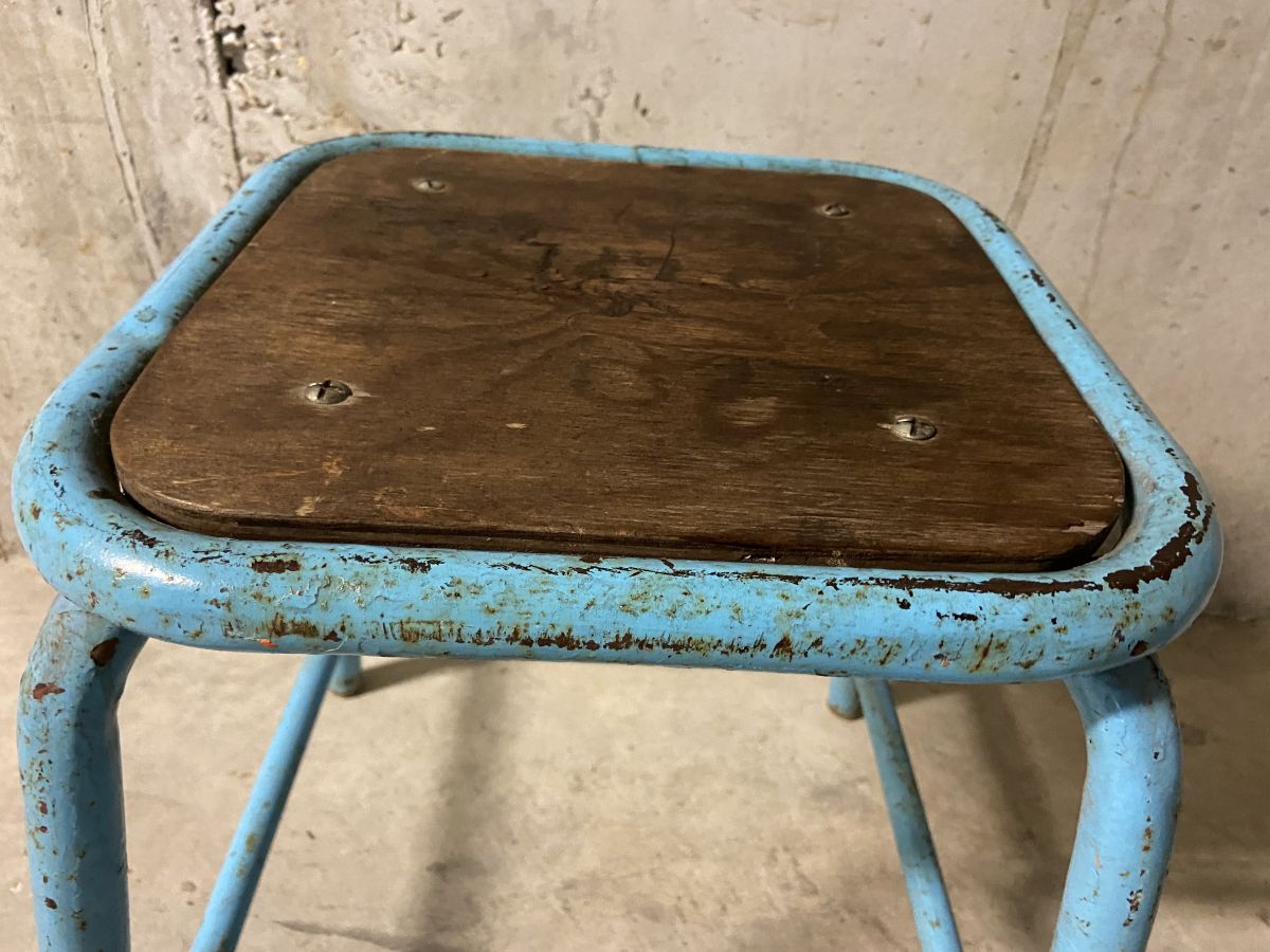 Tabouret industriel des années 50 en métal bleu vif et assise en bois, laissé volontairement dans son jus pour conserver tout le charme, la patine du temps et le vécu de l’objet, hauteur assise 43cm, assise 32x32cm, dimensions (cm) : L.40xH.43xP.40.