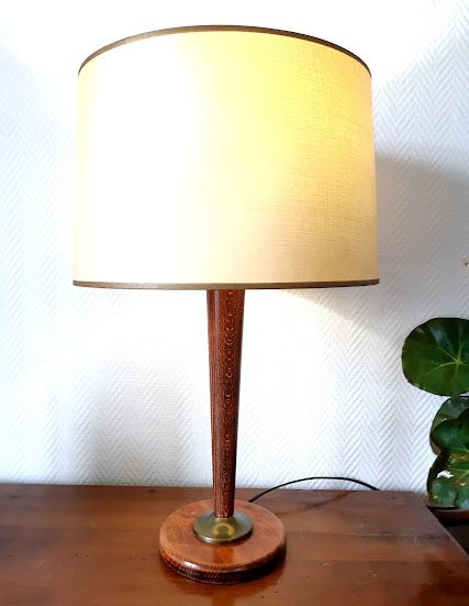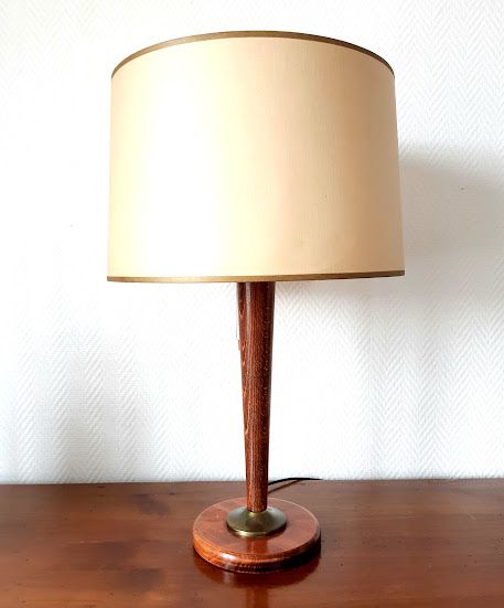 Pied de lampe de bureau, dite de paquebot, dans le style Mazda. Travail des années 1950. Base circulaire avec monture en métal doré, d'où s'élève un mat conique de bois teinté. Abat-jour cylindrique de grand modèle de couleur crème avec bordures en papier mordoré, quelques traces.