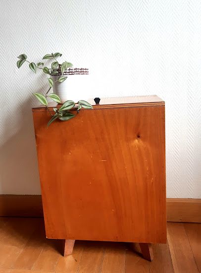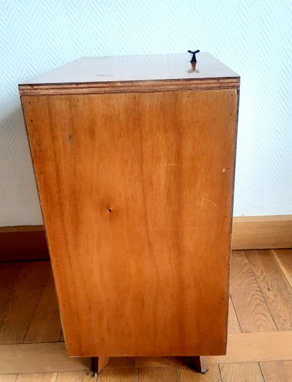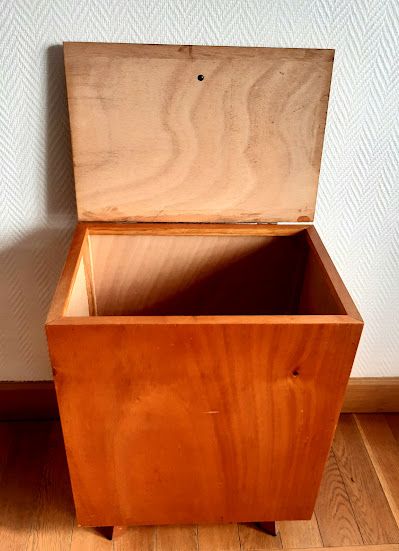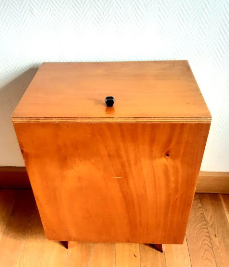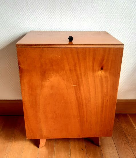 Coffre haut reposant sur quatre pieds, ouverture à ventail supérieur avec prise de bakélite noire.