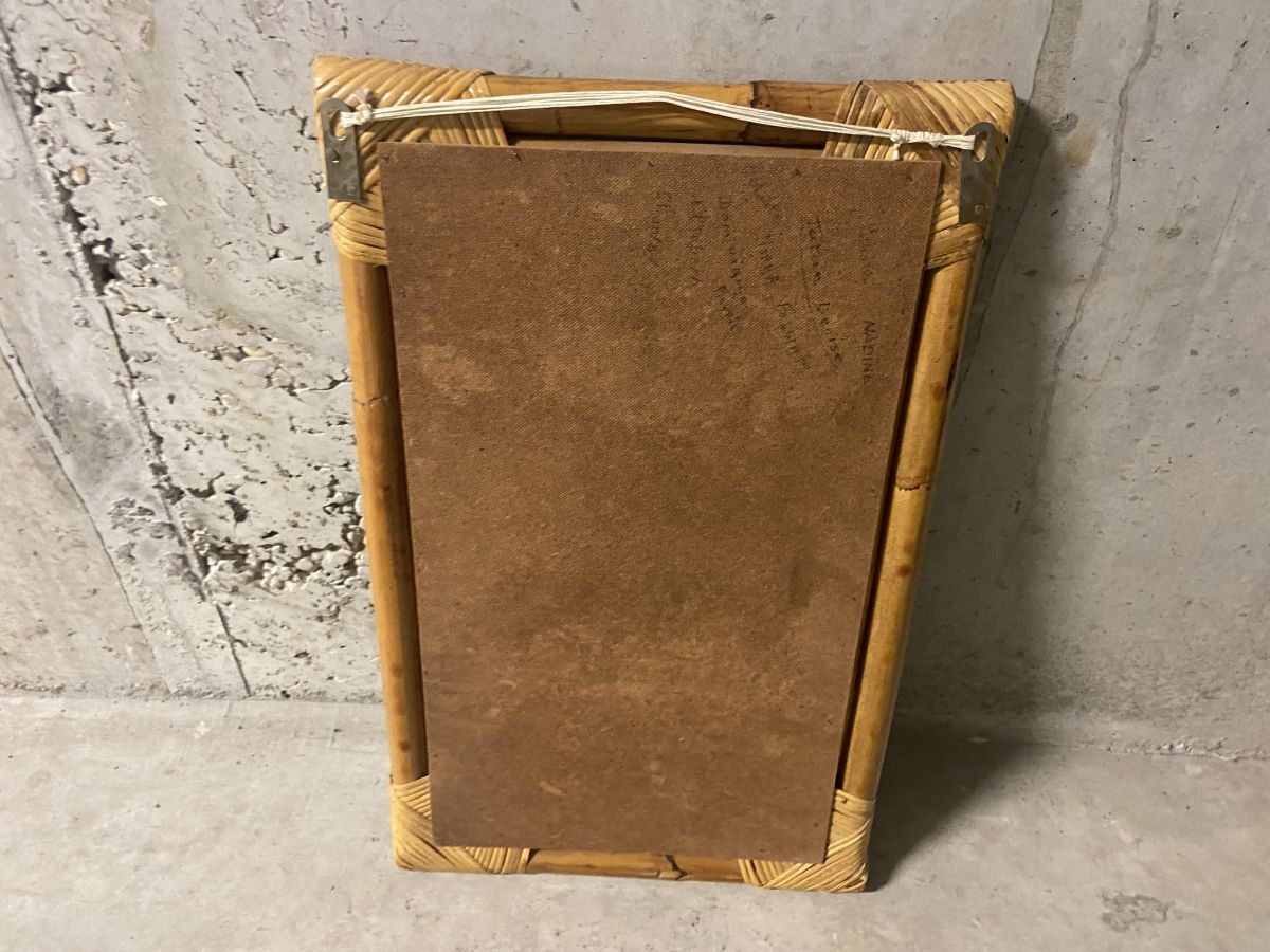 Miroir en bambou et rotin des années 60, cordelette à l’arrière pour le suspendre, dimensions (cm) : L.35xH.55xP.3, bon état.