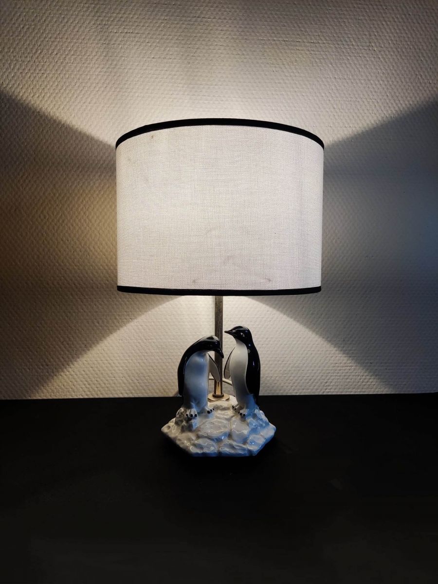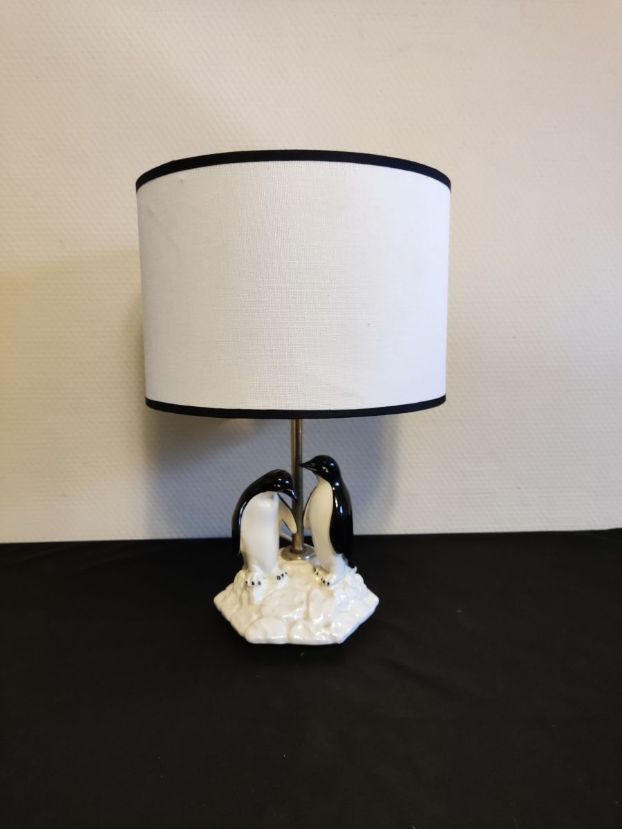 lampe pingouins en céramique noire et blanche avec abat-jour en tissu