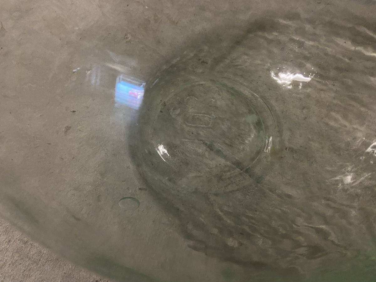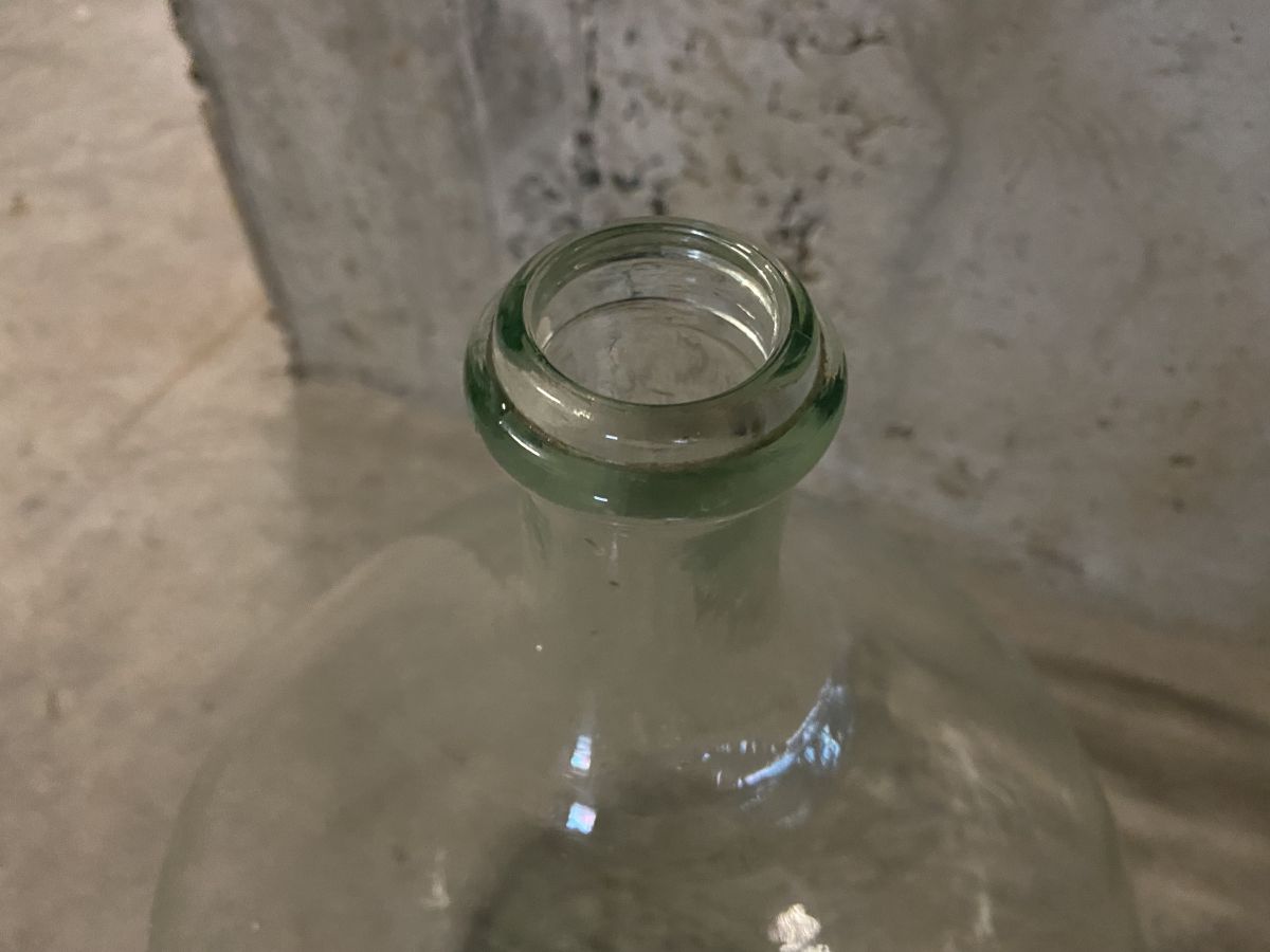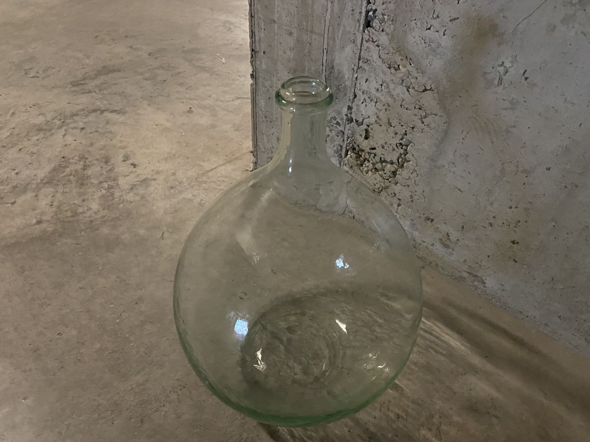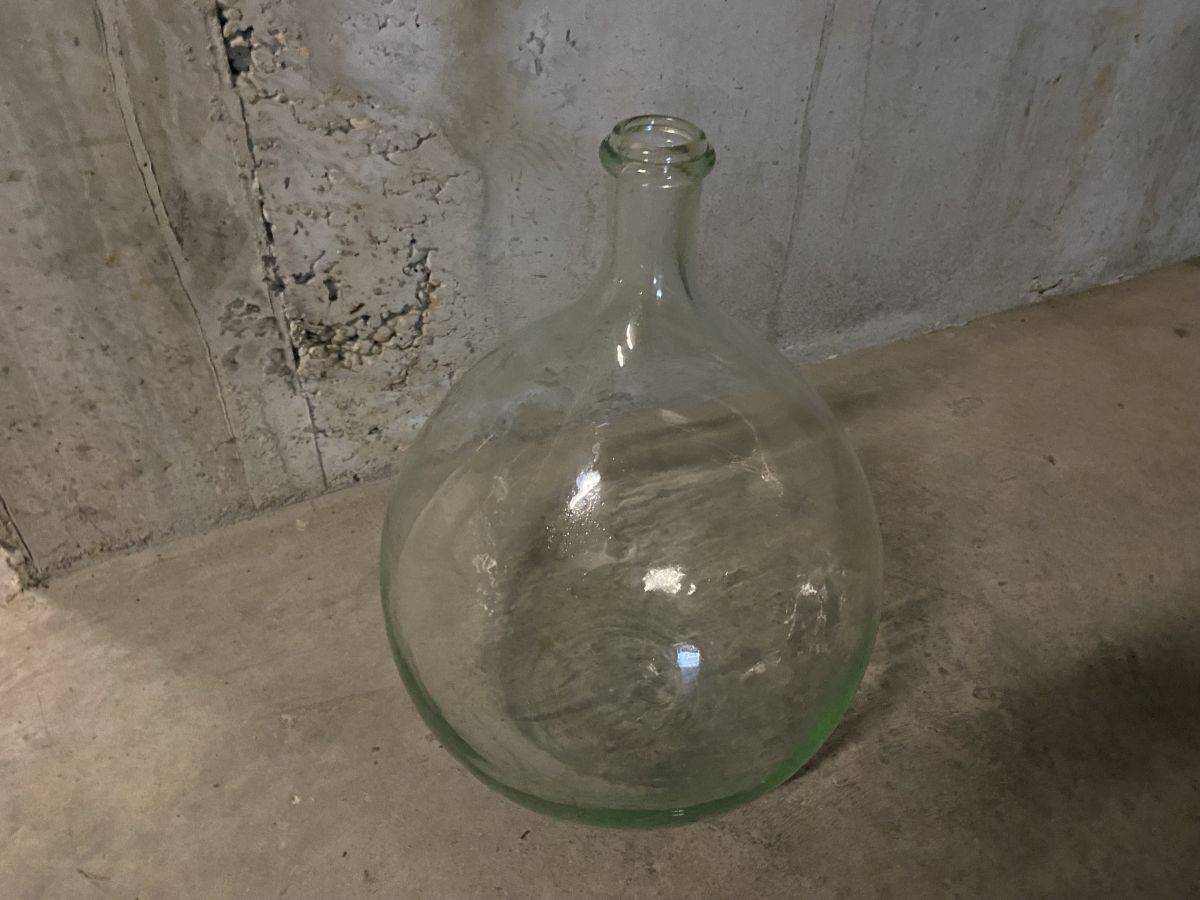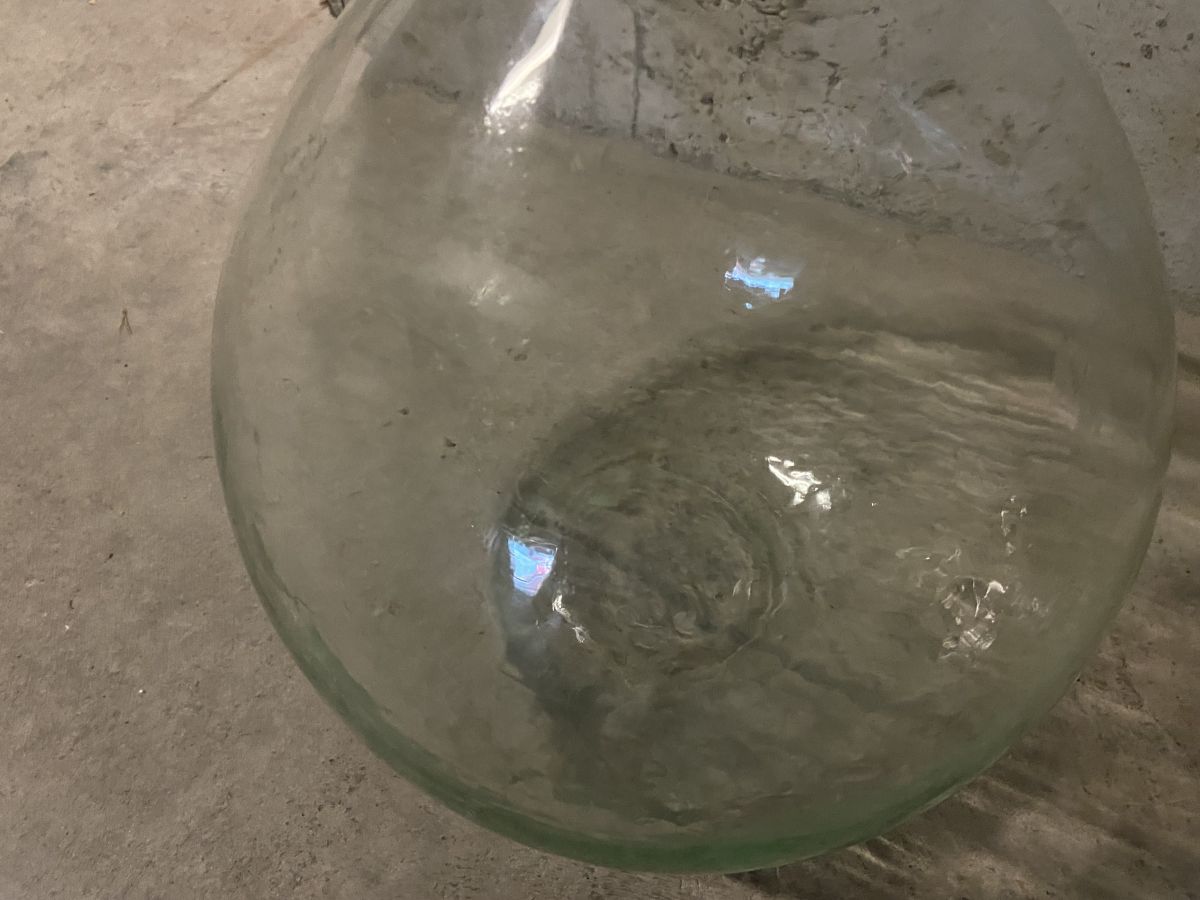 Dame Jeanne des années 50 en verre blanc, contenance 20L, soufflée d’un seule tenant (sans couture), hauteur 45cm, diamètre 30cm, bon état.