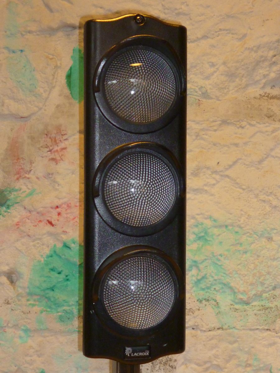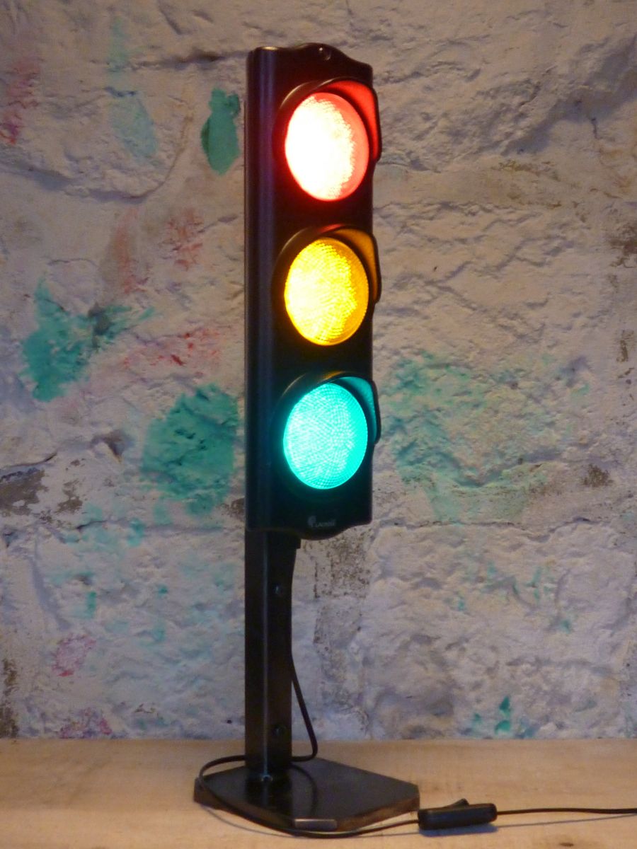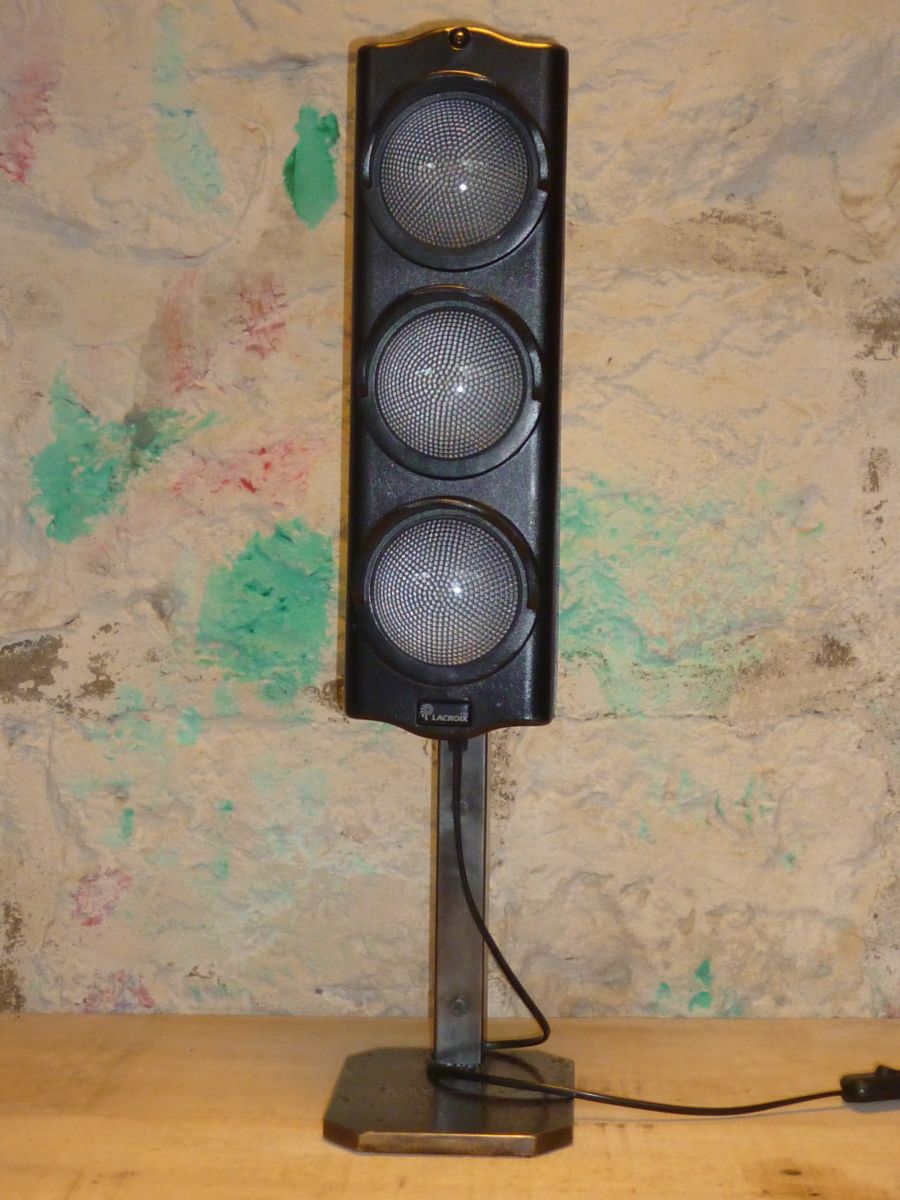 Lampe design industriel réalisée a partir d'un feu tricolore répétiteur en fonte d'aluminium .