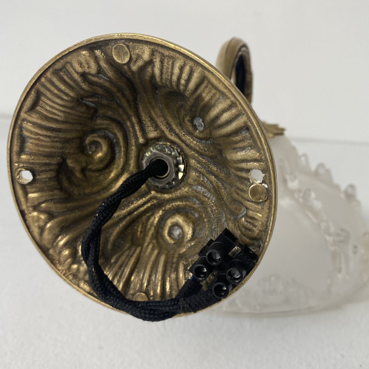 L’électricité a été refaite. Douille à vis petit culot (Ampoules E14). Branchement par domino. Fil noir en tissu tressé.