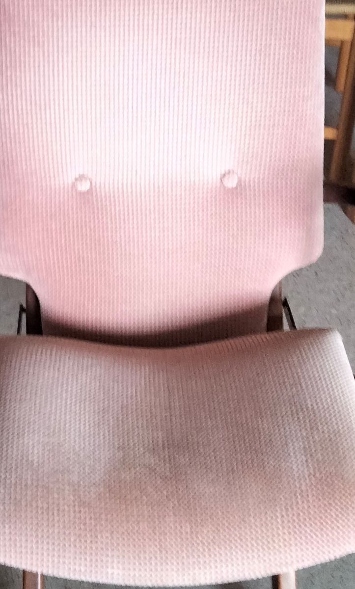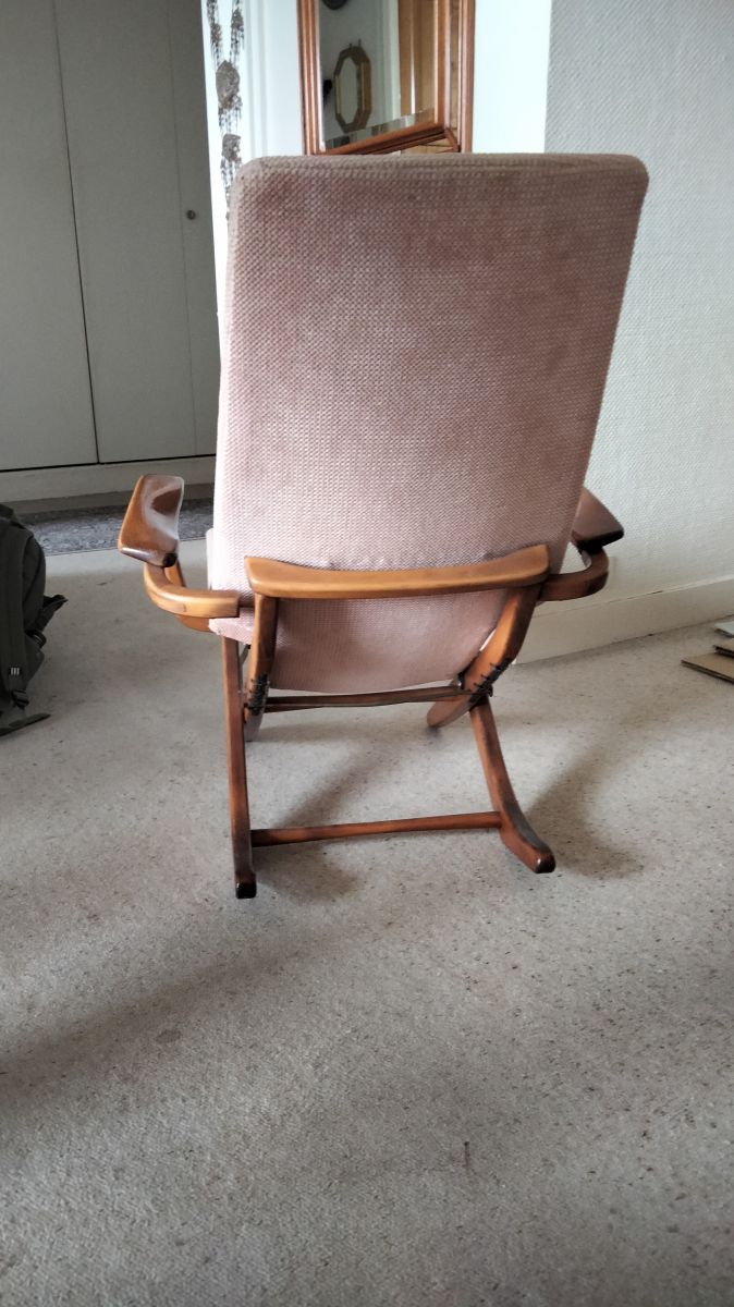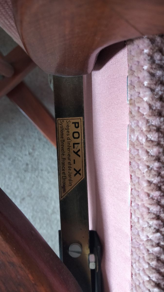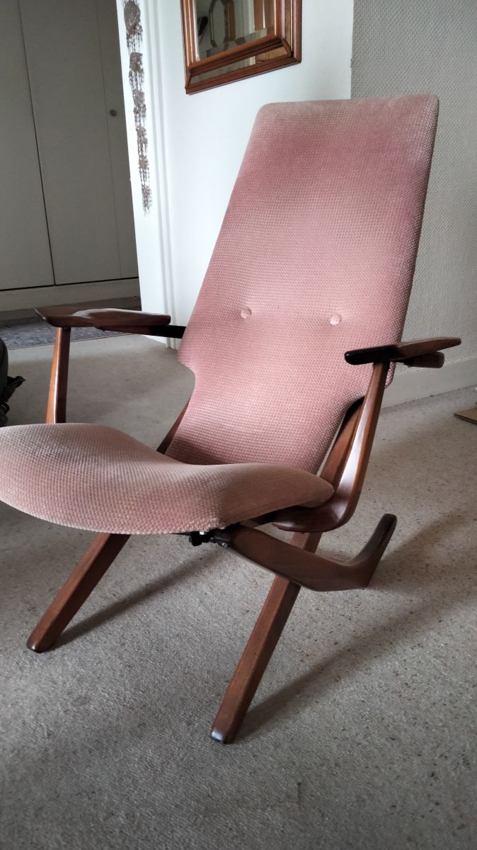 3 fauteuils Poly X à position réglable (4) par crémaillère. En bois foncé et velours vieux rose. Bon état mais tissu à faire nettoyer.
