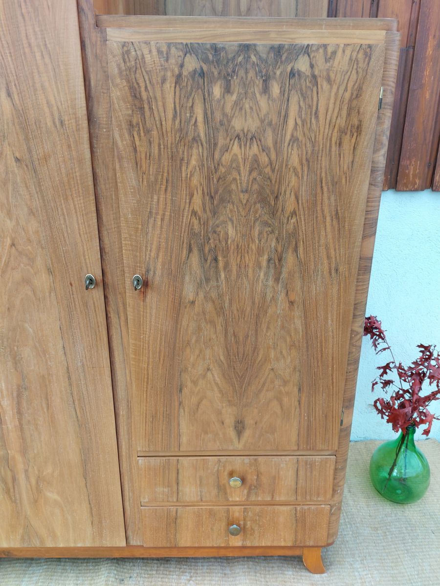 Armoire asymétrique art déco. Article de belle facture, en bois massif, qui apportera du charme à votre pièce. Ce meuble remplit 3 fonctions: à gauche, un espace penderie (qui s’ouvre sur l’avant ce qui est très pratique) + un rayon et un beau miroir biseauté. A droite, 3 autres étagères + 2 tiroirs. Les 2 hauteurs sont de 177 et 147cm. Ce meuble a été nettoyé. J’ai volontairement laissé le bois ainsi, brut, afin d’y apporter la finition de votre choix. Je peux, sans supplément, le cirer ou le vernir ce qui permettra de le rafraîchir et peut-être d’effacer les quelques tâches d’eau (cf photos). Avec un supplément, je peux peindre le meuble à la couleur de votre choix et/ou déco avec un papier peint à l’intérieur ou décopatch sur un tiroir par exemple.
